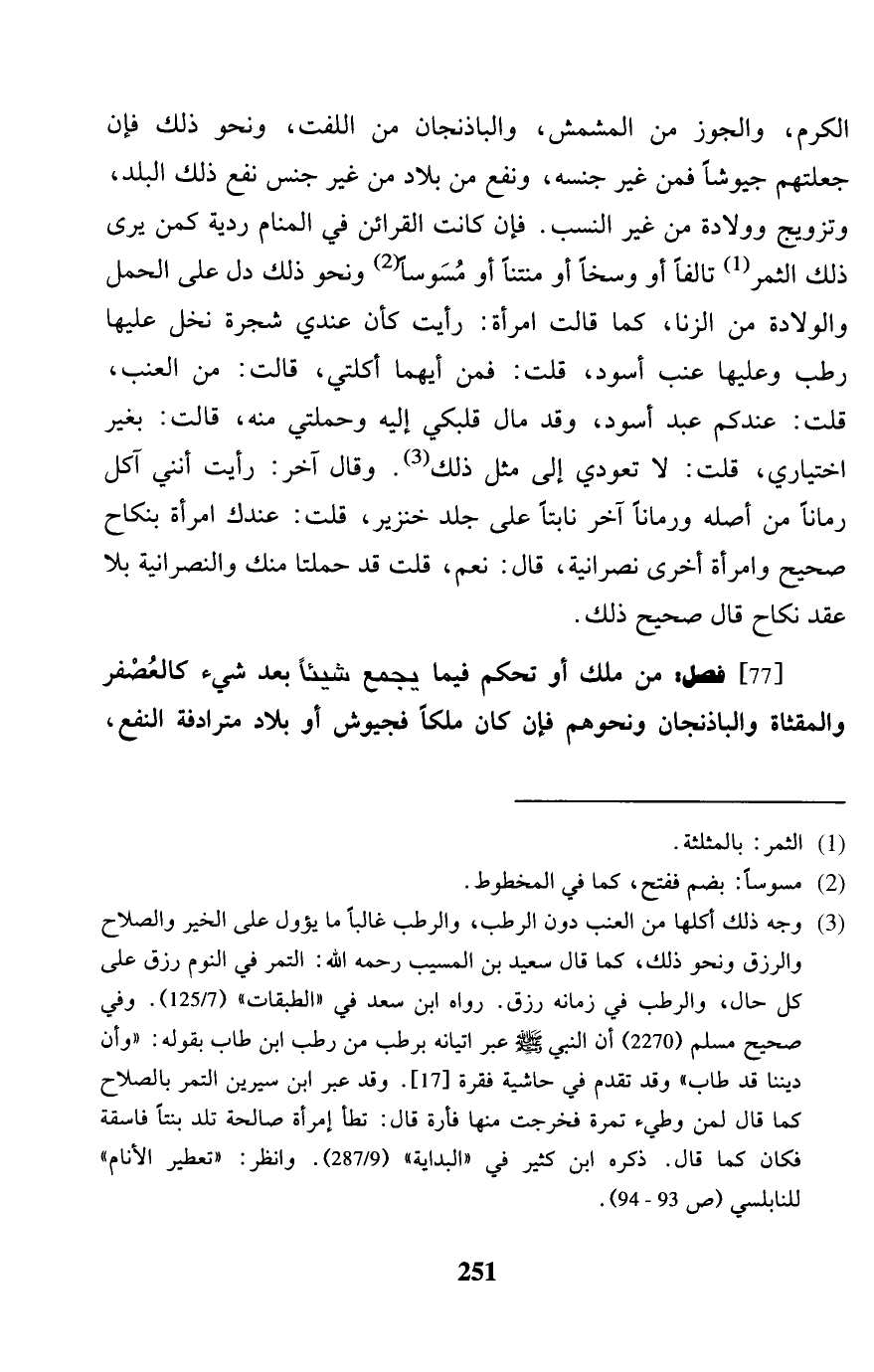 الْكَرم، والجوز من المشمش، والباذنجان من اللفت، وَنَحْو ذَلِك فَإِن جعلتهم جيوشاً فَمن غير جنسه، ونفع من بِلَاد من غير جنس نفع ذَلِك الْبَلَد، وتزويج وولادة من غير النّسَب. فَإِن كَانَت الْقَرَائِن فِي الْمَنَام ردية كمن يرى ذَلِك الثَّمر تَالِفا أَو وسخاً أَو منتناً أَو مسوساً وَنَحْو ذَلِك دلّ على الْحمل والولادة من الزِّنَا، كَمَا قَالَت امْرَأَة: رَأَيْت كَأَن عِنْدِي شَجَرَة نخل عَلَيْهَا رطب وَعَلَيْهَا عِنَب أسود، قلت: فَمن أَيهمَا أكلتي، قَالَت: من الْعِنَب، قلت: عنْدكُمْ عبد أسود، وَقد مَال قلبكي إِلَيْهِ وحملتي مِنْهُ، قَالَت: بِغَيْر اخْتِيَاري، قلت: لَا تعودي إِلَى مثل ذَلِك. وَقَالَ آخر: رَأَيْت أنني آكل رماناً من أَصله ورماناً آخر نباتاً على جلد خِنْزِير، قلت: عنْدك امْرَأَة بِنِكَاح صَحِيح وَامْرَأَة أُخْرَى نَصْرَانِيَّة، قَالَ: نعم، قلت قد حملتا مِنْك والنصرانية بِلَا عقد نِكَاح قَالَ صَحِيح ذَلِك.