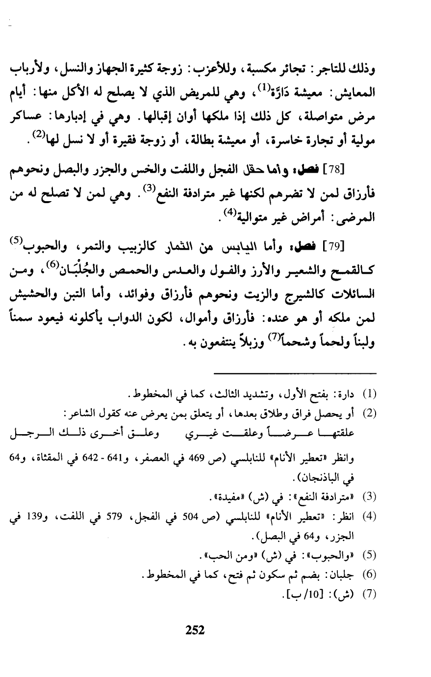 [78] فصل: وَأما حقل الفجل واللفت والخس والجزر والبصل وَنَحْوهم فأرزاق لمن لَا تَضُرهُمْ لَكِنَّهَا غير مترادفة النَّفْع. وَهِي لمن لَا تصلح لَهُ من المرضى: أمراض غير مُتَوَالِيَة.