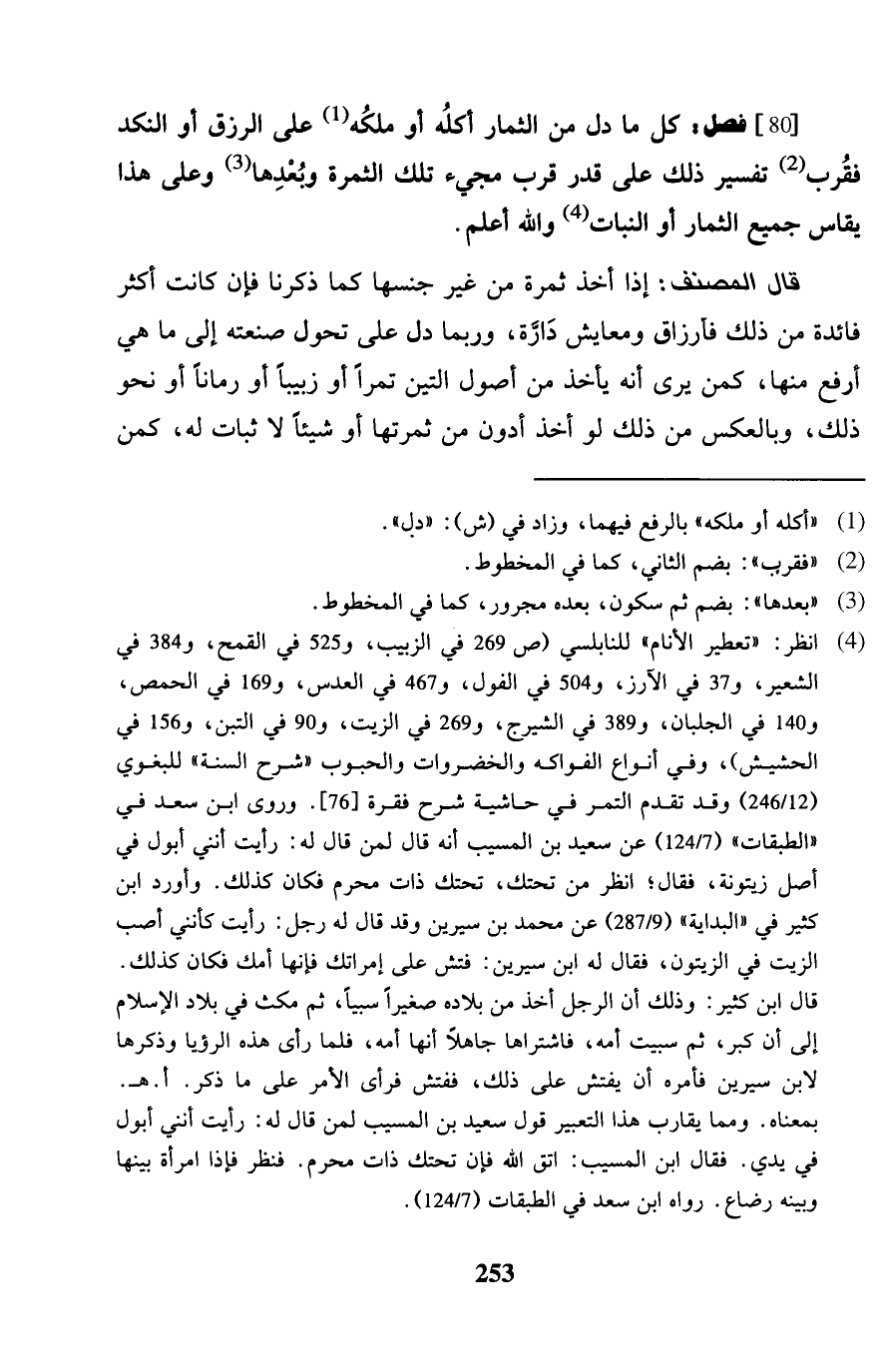 [80] فصل: كل مَا دلّ من الثِّمَار أكله أَو ملكه على الرزق أَو النكد فَقرب تَفْسِير ذَلِك على قدر قرب مَجِيء تِلْكَ الثَّمَرَة وَبعدهَا وعَلى هَذَا يُقَاس جَمِيع الثِّمَار أَو النَّبَات وَالله أعلم. قَالَ المُصَنّف: إِذا أَخذ ثَمَرَة من غير جِنْسهَا كَمَا ذكرنَا فَإِن كَانَت أَكثر فَائِدَة من ذَلِك فأرزاق ومعايش دارة، وَرُبمَا دلّ على تحول صَنعته إِلَى مَا هِيَ أرفع مِنْهَا، كمن يرى أَنه يَأْخُذ من أصُول التِّين تَمرا أَو زبيباً أَو رماناً أَو نَحْو ذَلِك، وَبِالْعَكْسِ من ذَلِك لَو أَخذ أدون من ثَمَرَتهَا أَو شَيْئا لَا ثبات لَهُ، كمن