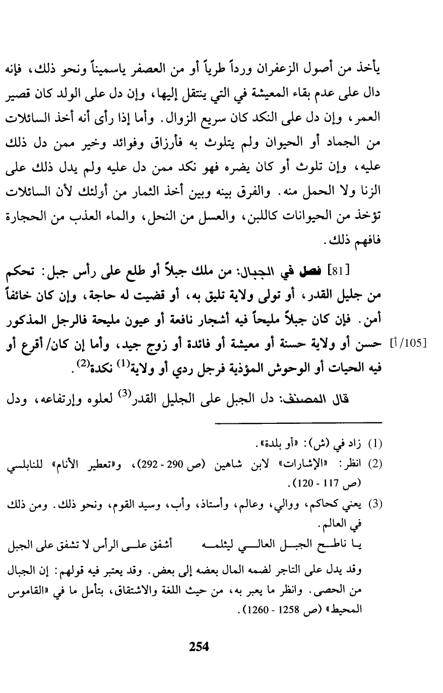 [81] فصل فِي الْجبَال: من كلك جبلا أَو طلع على رَأس جبل: تحكم من جليل الْقدر، أَو تولى ولَايَة تلِيق بِهِ، أَو قضيت لَهُ حَاجَة، وَإِن كَانَ خَائفًا أَمن. فَإِن كَانَ جبلا مليحاً فِيهِ أَشجَار نافعة أَو عُيُون مليحة فالرجل الْمَذْكُور حسن أَو ولَايَة حَسَنَة أَو معيشة أَو فَائِدَة أَو زوج جيد، وَأما إِن كَانَ / أَقرع أَو فِيهِ الْحَيَّات أَو الوحوش المؤذية فَرجل ردي أَو ولَايَة نكدة. قَالَ المُصَنّف: دلّ الْجَبَل على الْجَلِيل الْقدر لعلوه وإرتفاعه، وَدلّ