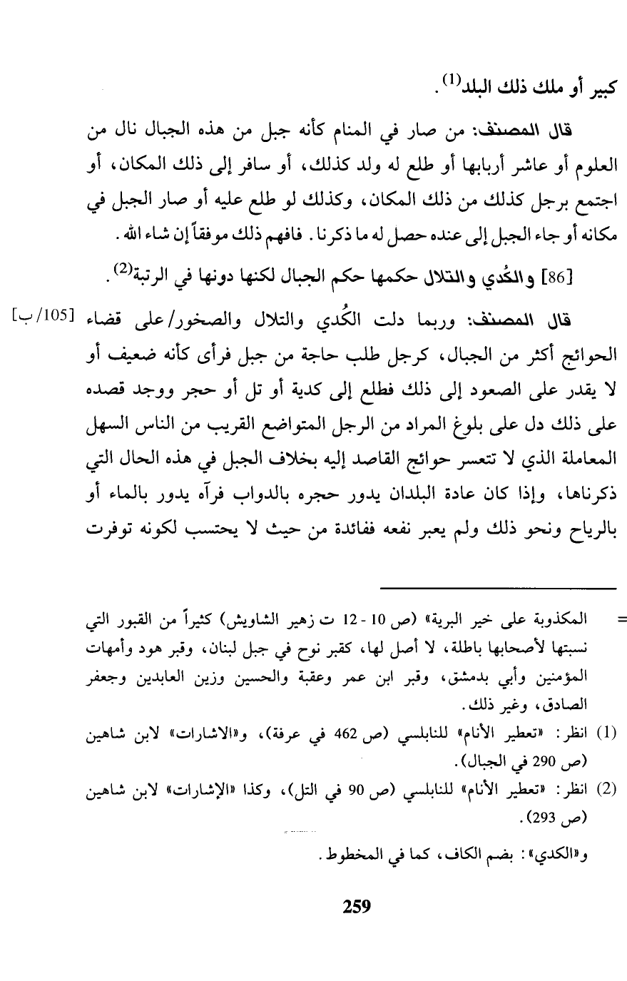 [86] والكدي والتلال حكمهَا حكم الْجبَال لَكِنَّهَا دونهَا فِي الرُّتْبَة. قَالَ المُصَنّف: وَرُبمَا دلّت الكدي والتلال والصخور / على قَضَاء الْحَوَائِج أَكثر من الْجبَال، كَرجل طلب حَاجَة من جبل فَرَأى كَأَنَّهُ ضَعِيف أَو لَا يقدر على الصعُود إِلَى ذَلِك فطلع إِلَى كدية أَو تل أَو حجر وَوجد قَصده على ذَلِك دلّ على بُلُوغ المُرَاد من الرجل المتواضع الْقَرِيب من النَّاس السهل الْمُعَامَلَة الَّذِي لَا تتعسر حوائج القاصد إِلَيْهِ بِخِلَاف الْجَبَل فِي هَذِه الْحَال الَّتِي ذَكرنَاهَا، وَإِذا كَانَ عَادَة الْبلدَانِ يَدُور حجره بالدواب فَرَآهُ يَدُور بِالْمَاءِ أَو بالرياح وَنَحْو ذَلِك وَلم يعبر نَفعه ففائدة من حَيْثُ لَا يحْتَسب لكَونه توفرت