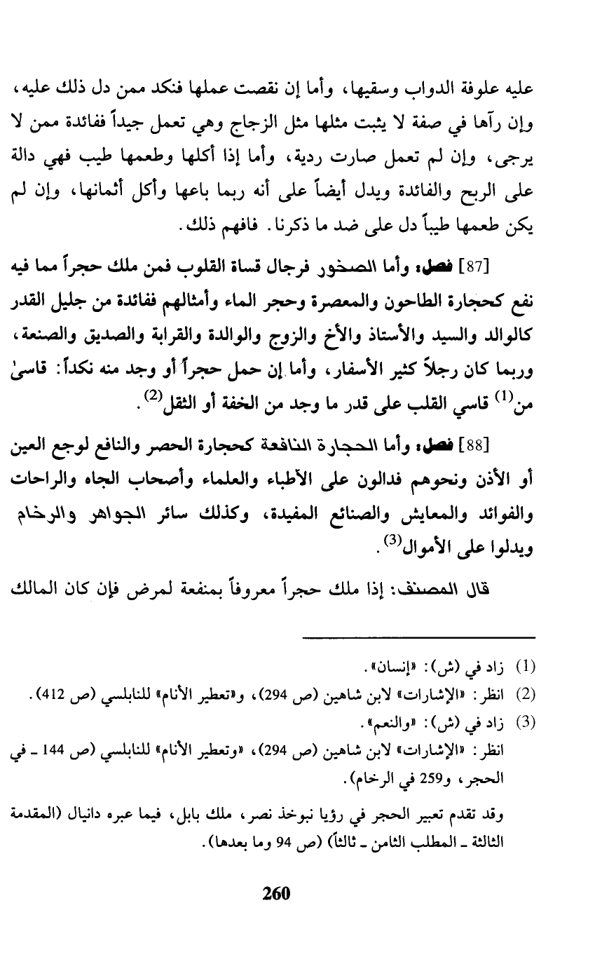 [88] فصل: وَأما الْحِجَارَة النافعة كحجارة الْحصْر والنافع لوجع الْعين أَو الْأذن وَنَحْوهم فدالون على الْأَطِبَّاء وَالْعُلَمَاء وَأَصْحَاب الجاه والراحات والفوائد والمعايش والصنائع المفيدة، وَكَذَلِكَ سَائِر الْجَوَاهِر والرخام ويدلوا على الْأَمْوَال. قَالَ المُصَنّف: إِذا ملك حجرا مَعْرُوفا بِمَنْفَعَة لمَرض فَإِن كَانَ الْمَالِك