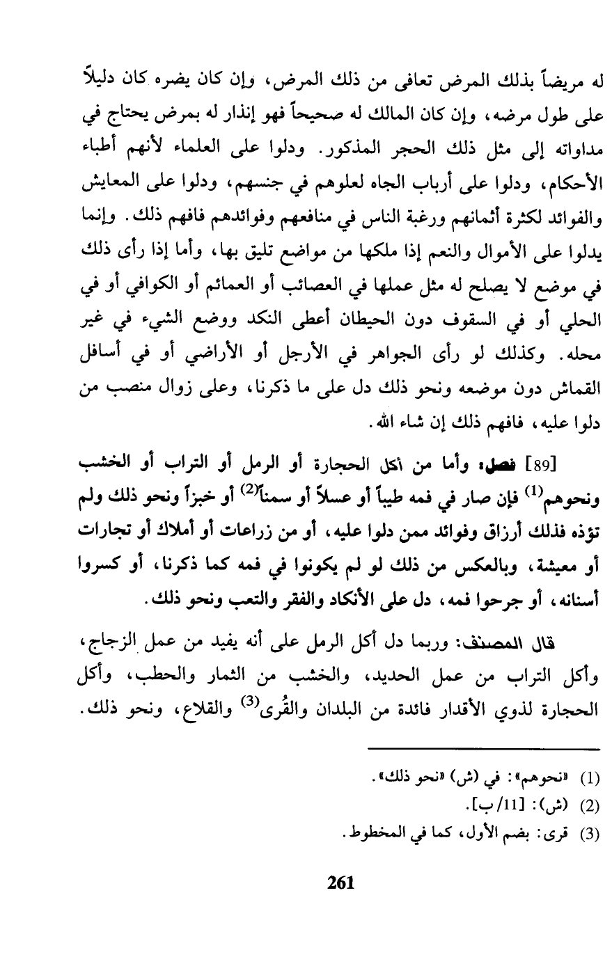 [89] فصل: وَأما من أكل الْحِجَارَة أَو الرمل أَو التُّرَاب أَو الْخشب وَنَحْوهم فَإِن صَار فِي فَمه طيبا أَو عسلاً أَو خبْزًا وَنَحْو ذَلِك وَلم تؤذه فَذَلِك أرزاق وفوائد مِمَّن دلوا عَلَيْهِ، أَو من زراعات أَو أَمْلَاك أَو تِجَارَات أَو معيشة، وَبِالْعَكْسِ من ذَلِك لَو لم يَكُونُوا فِي فَمه كَمَا ذكرنَا، أَو كسروا أَسْنَانه، أَو جرحوا فَمه، دلّ على الأنكاد والفقر والتعب وَنَحْو ذَلِك. قَالَ المُصَنّف: وَرُبمَا دلّ أكل الرمل على أَنه يُفِيد من عمل الزّجاج، وَأكل التُّرَاب من عمل الْحَدِيد، والخشب من الثِّمَار والحطب، وَأكل الْحِجَارَة لِذَوي الأقدار فَائِدَة من الْبلدَانِ والقرى والقلاع، وَنَحْو ذَلِك.