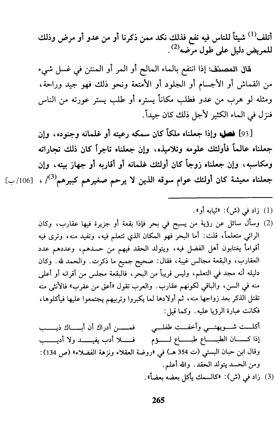 [93] فصل: وَإِذا جَعَلْنَاهُ ملكا كَانَ سمكه رَعيته أَو غلمانه وَجُنُوده، وَإِن جَعَلْنَاهُ عَالما فَأُولَئِك علومه وتلاميذه، وَإِن جَعَلْنَاهُ تَاجِرًا كَانَ ذَلِك تِجَارَته ومكاسبه، وَإِن جَعَلْنَاهُ زوجا أُولَئِكَ غلمانه أَو أَقَاربه أَو جهاز بَيته، وَإِن جَعَلْنَاهُ معيشة كَانَ أُولَئِكَ عوام سوقه الَّذين لَا يرحم صَغِيرهمْ كَبِيرهمْ /،