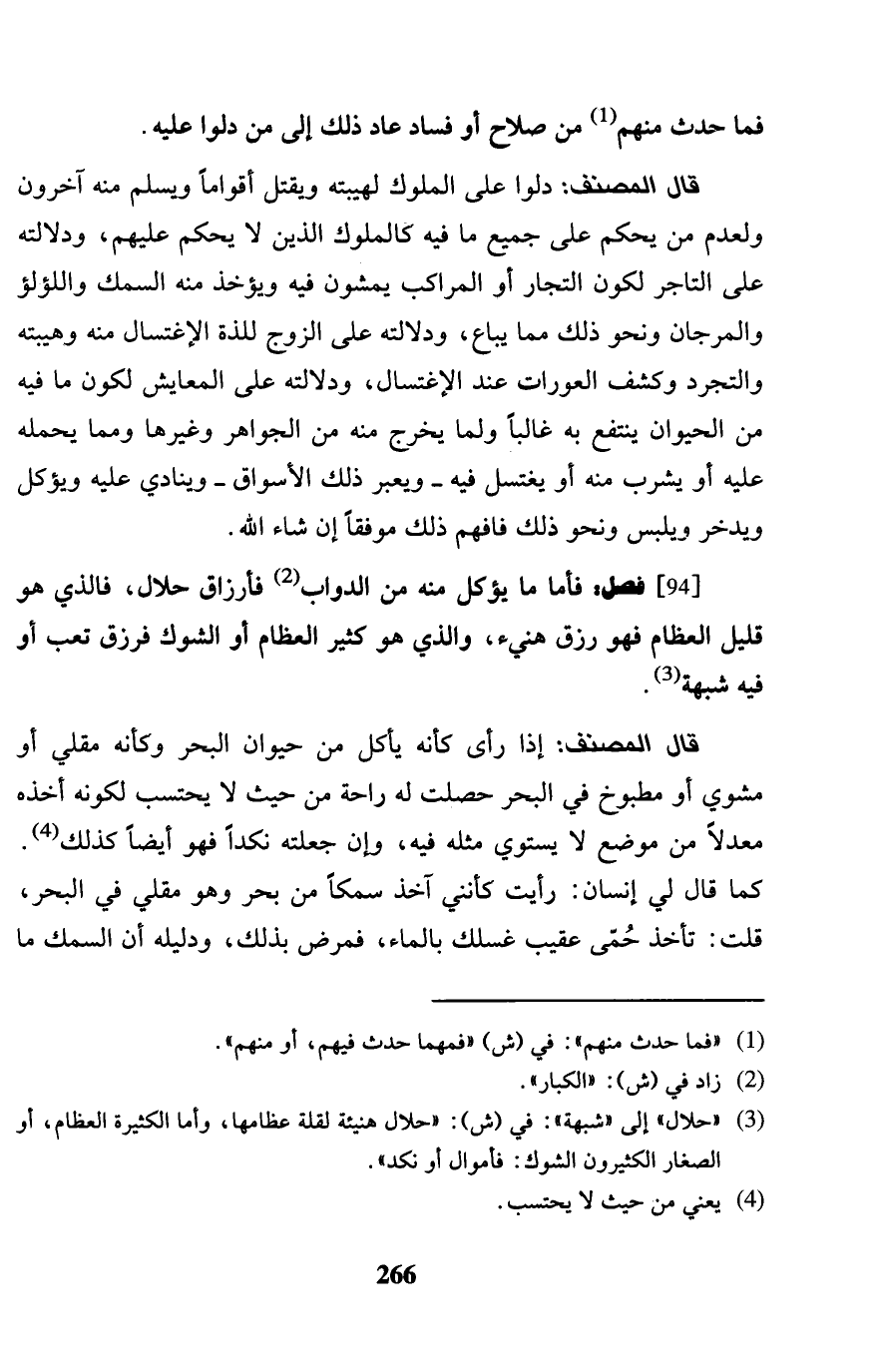 [94] فصل: فَأَما مَا يُؤْكَل مِنْهُ من الدَّوَابّ فارزاق حَلَال، فَالَّذِي هُوَ قَلِيل الْعِظَام فَهُوَ رزق هنيء، وَالَّذِي هُوَ كثير الْعِظَام أَو الشوك فرزق تَعب أَو فِيهِ شُبْهَة. قَالَ المُصَنّف: إِذا رأى كَأَنَّهُ يَأْكُل من حَيَوَان الْبَحْر وَكَأَنَّهُ مقلي أَو مشوي أَو مطبوخ فِي الْبَحْر حصلت لَهُ رَاحَة من حَيْثُ لَا يحْتَسب لكَونه أَخذه معدلاً من مَوضِع لَا يَسْتَوِي مثله فِيهِ، وَإِن جعلته نكداً فَهُوَ أَيْضا كَذَلِك. كَمَا قَالَ لي إِنْسَان: رَأَيْت كأنني آخذ سمكًا من بَحر وَهُوَ مقلي فِي الْبَحْر، قلت: تَأْخُذ حمى عقيب غسلك بِالْمَاءِ، فَمَرض بذلك، وَدَلِيله أَن السّمك مَا