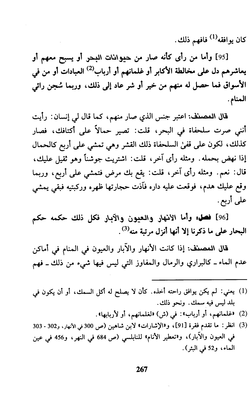 [96] فصل: وَأما الْأَنْهَار والعيون والآبار فَكل ذَلِك حكمه حكم الْبحار على مَا ذكرنَا إِلَّا أَنَّهَا أنزل مرتبَة مِنْهُ. قَالَ المُصَنّف: إِذا كَانَت الْأَنْهَار والآبار والعيون فِي الْمَنَام فِي أَمَاكِن عدم المَاء - كالبراري والرمال والمفاوز الَّتِي لَيْسَ فِيهَا شَيْء من ذَلِك - فهم