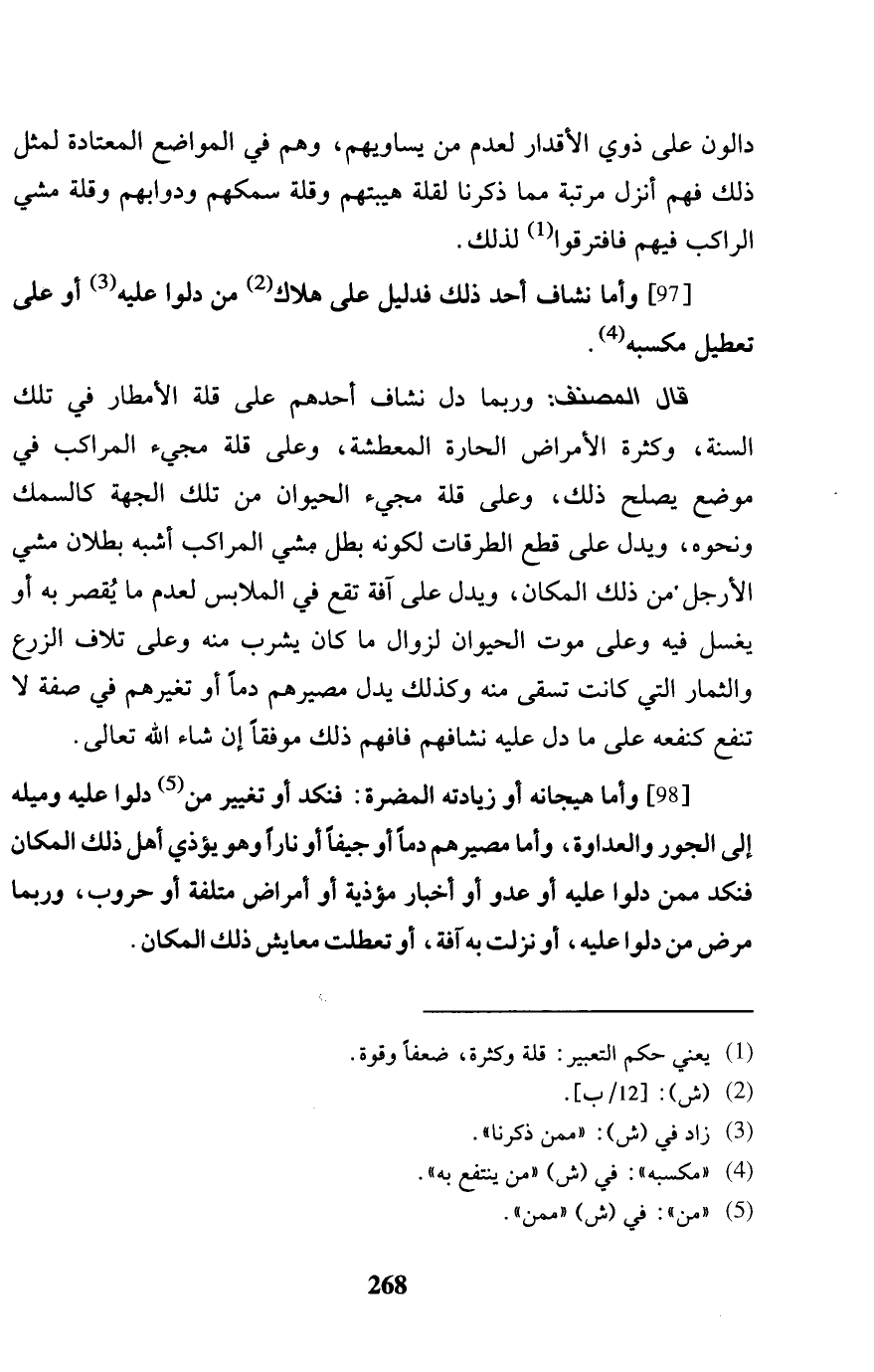 [97] وَأما نشاف أحد ذَلِك فدليل على هَلَاك من دلوا عَلَيْهِ أَو على تَعْطِيل مكسبه. قَالَ المُصَنّف: وَرُبمَا دلّ نشاف أحدهم على قلَّة الأمطار فِي تِلْكَ السّنة، وَكَثْرَة الْأَمْرَاض الحارة المعطشة، وعَلى قلَّة مَجِيء المراكب فِي مَوضِع يصلح ذَلِك، وعَلى قلَّة مَجِيء الْحَيَوَان من تِلْكَ الْجِهَة كالسمك وَنَحْوه، وَيدل على قطع الطرقات لكَونه بَطل مشي المراكب أشبه بطلَان مشي الأرجل من ذَلِك الْمَكَان، وَيدل على آفَة تقع فِي الملابس لعدم مَا يقصر بِهِ أَو يغسل فِيهِ وعَلى موت الْحَيَوَان لزوَال مَا كَانَ يشرب مِنْهُ وعَلى تلاف الزَّرْع وَالثِّمَار الَّتِي كَانَت تسقى مِنْهُ وَكَذَلِكَ يدل مصيرهم دَمًا أَو تغرهم فِي صفة لَا تَنْفَع كنفعه على مَا دلّ عَلَيْهِ نشافهم فَافْهَم ذَلِك موفقاً إِن شَاءَ الله تَعَالَى.