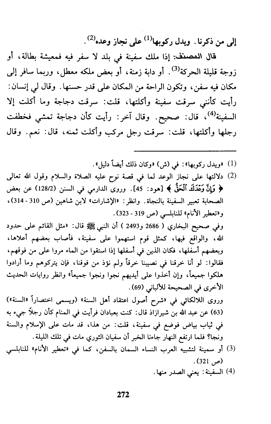 إِلَى من ذكرنَا. وَيدل ركُوبهَا على نجاز وعده. قَالَ المُصَنّف: إِذا ملك سفينة فِي بلد لَا سفر فِيهِ فمعيشة بطالة، أَو زَوْجَة قَليلَة الْحَرَكَة. أَو دَابَّة زمنة، أَو بعض ملكه معطل، وَرُبمَا سَافر إِلَى مَكَان فِيهِ سفن، وَتَكون الرَّاحَة من الْمَكَان على قدر حسنها. وَقَالَ لي إِنْسَان: رَأَيْت كأنني سرقت سفينة وأكلتها، قلت سرقت دجَاجَة تمشي فخطفت رجلهَا وأكلتها، قلت: سرقت رجل مركب وأكلت ثمنه، قَالَ: نعم. وَقَالَ