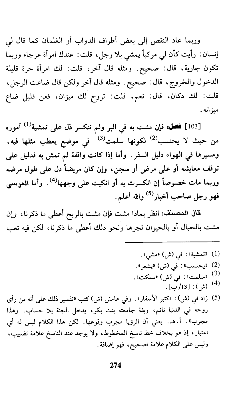 وَرُبمَا عَاد النَّقْص إِلَى بعض أَطْرَاف الدَّوَابّ أَو الغلمان كَمَا قَالَ لي إِنْسَان: رَأَيْت كَأَن لي مركبا يمشي بِلَا رجل، قلت: عنْدك امْرَأَة عرجاء وَرُبمَا تكون جَارِيَة، قَالَ: صَحِيح. وَمثله قَالَ آخر، قلت: لَك امْرَأَة حرَّة قَليلَة الدُّخُول وَالْخُرُوج، قَالَ: صَحِيح. وَمثله قَالَ آخر وَلَكِن قَالَ ضَاعَت الرجل، قلت: لَك دكان، قَالَ: نعم، قلت: تروح لَك ميزَان، فَعَن قَلِيل ضَاعَ مِيزَانه.