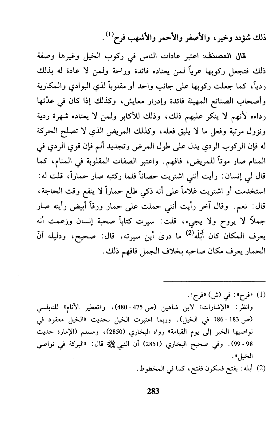 ذَلِك سؤدد وَخير، والأصفر والأحمر والأشهب فَرح. قَالَ المُصَنّف: اعْتبر عادات النَّاس فِي ركُوب الْخَيل وَغَيرهَا وَصفَة ذَلِك فتجعل ركُوبهَا عرياً لمن يعتاده فَائِدَة وراحة وَلمن لَا عَادَة لَهُ بذلك ردياً، كَمَا جعلت ركُوبهَا على جَانب وَاحِد أَو مقلوباً لذِي الْبَوَادِي والمكارية وَأَصْحَاب الصَّنَائِع المهينة فَائِدَة وإدرار معايش، وَكَذَلِكَ إِذا كَانَ فِي عدتهَا رداءة لأَنهم لَا يُنكر عَلَيْهِم ذَلِك، وَذَلِكَ للأكابر وَلمن لَا يعتاده شهرة ردية وَذُو مرتبَة وَفعل مَا لَا يَلِيق فعله، وَكَذَلِكَ الْمَرِيض الَّذِي لَا تصلح الْحَرَكَة لَهُ فَإِن الرّكُوب الردي يدل على طول الْمَرَض وتجديد ألم فَإِن قوي الردي فِي الْمَنَام صَار موتا للْمَرِيض، فَافْهَم. وَاعْتبر الصِّفَات المقلوبة فِي الْمَنَام، كَمَا قَالَ لي إِنْسَان: رَأَيْت أنني اشْتريت حصاناً فَلَمَّا ركبته صَار حمارا، قلت لَهُ: استخدمت أَو اشْتريت غُلَاما على أَنه ذكي طلع حمارا لَا ينفع وَقت الْحَاجة، قَالَ: نعم. وَقَالَ آخر رَأَيْت أنني حملت على حمَار وَرقا أَبيض رَأَيْته صَار جملا لَا يروح وَلَا يَجِيء، قلت ك سيرت كتابا صُحْبَة إِنْسَان وَزَعَمت أَنه يعرف الْمَكَان كَانَ أبلة مَا درى أَيْن سيرته، قَالَ: صَحِيح، وَدَلِيله أَن الْحمار يعرف مَكَان صَاحبه بِخِلَاف الْجمل فَافْهَم ذَلِك.