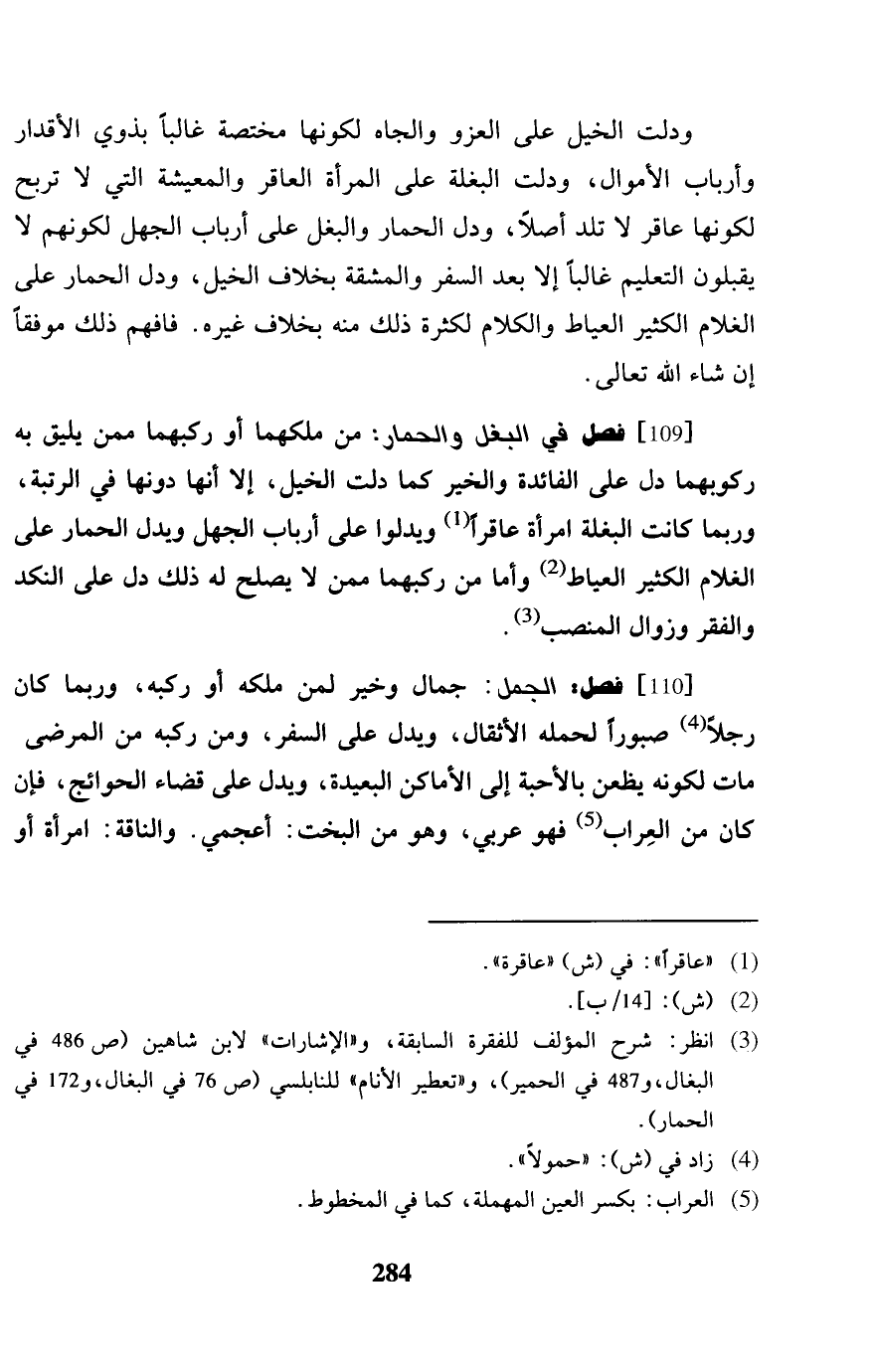 [109] فصل فِي الْبَغْل وَالْحمار: من ملكهَا أَو ركبهَا مِمَّن يَلِيق بِهِ ركوبهما دلّ على الْفَائِدَة وَالْخَيْر كَمَا دلّت الْخَيل، إِلَّا أَنَّهَا دونهَا فِي الرُّتْبَة، وَرُبمَا كَانَت البغلة امْرَأَة عاقراً ويدلوا على أَرْبَاب الْجَهْل وَيدل الْحمار على الْغُلَام الْكثير العياط وَأما من ركبهَا مِمَّن لَا يصلح لَهُ ذَلِك دلّ على النكد والفقر وَزَوَال المنصب.