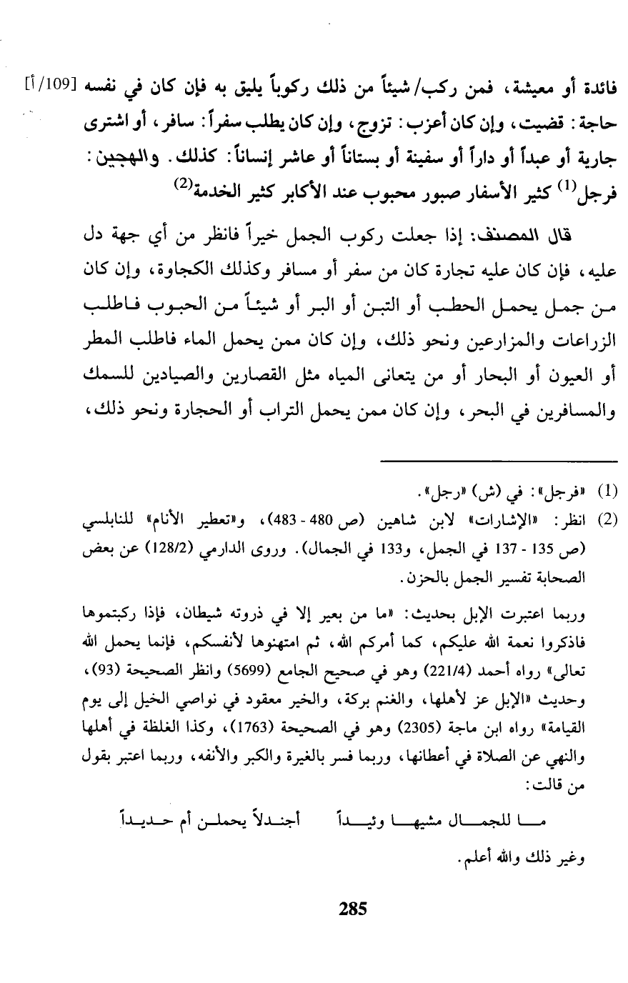 فَائِدَة أَو معيشة، فَمن ركب / شَيْئا من ذَلِك ركوباً يَلِيق بِهِ فَإِن كَانَ فِي نَفسه حَاجَة: قضيت، وَإِن كَانَ أعزب: تزوج، وَإِن كَانَ يطْلب سفرا: سَافر، أَو اشْترى جَارِيَة أَو عبدا أَو دَارا أَو سفينة أَو بستاناً أَو عَاشر إنْسَانا: كَذَلِك. والهجين: فَرجل كثير الْأَسْفَار صبور مَحْبُوب عِنْد الأكابر كثير الْخدمَة. قَالَ المُصَنّف: إِذا جعلت ركُوب الْجمل خيرا فَانْظُر من أَي جِهَة دلّ عَلَيْهِ، فَإِن كَانَ عَلَيْهِ تِجَارَة كَانَ من سفر أَو مُسَافر وَكَذَلِكَ الكجاوة، وَإِن كَانَ من جمل يحمل الْحَطب أَو التِّبْن أَو الْبر أَو شَيْئا من الْحُبُوب فاطلب الزراعات والمزارعين وَنَحْو ذَلِك، وَإِن كَانَ مِمَّن يحمل المَاء فاطلب الْمَطَر أَو الْعُيُون أَو الْبحار أَو من يتعانى الْمِيَاه مثل القصارين والصيادين للسمك والمسافرين فِي الْبَحْر، وَإِن كَانَ مِمَّن يحمل التُّرَاب أَو الْحِجَارَة وَنَحْو ذَلِك،