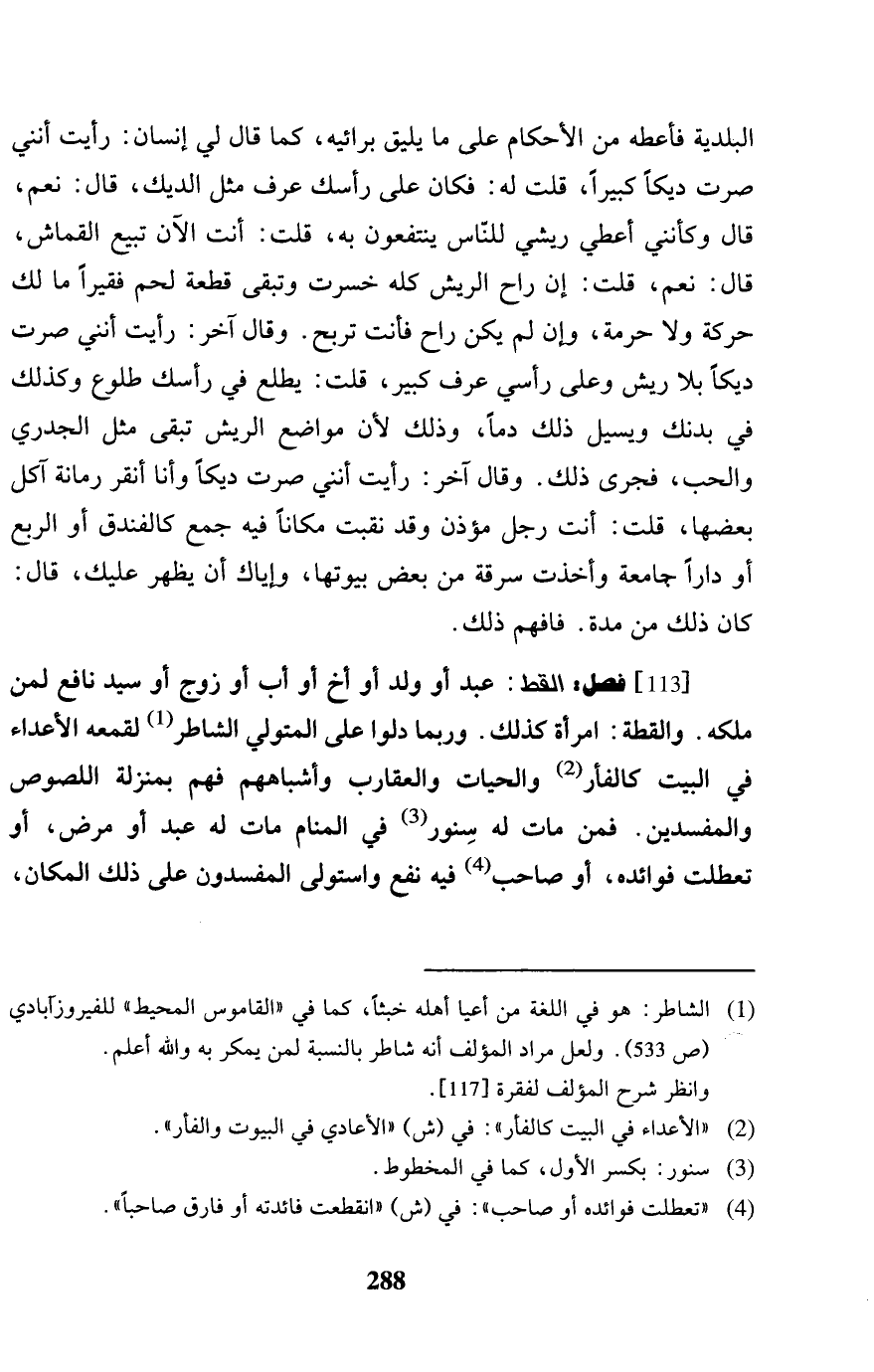 البلدية فأعطه من الْأَحْكَام على مَا يَلِيق برائيه، كَمَا قَالَ لي إِنْسَان: رَأَيْت أنني صرت ديكا كَبِيرا، قلت لَهُ: فَكَانَ على رَأسك عرف مثل الديك، قَالَ: نعم، قَالَ وكأنني أعطي ريشي للنَّاس يَنْتَفِعُونَ بِهِ، قلت: أَنْت الْآن تبيع القماش، قَالَ: نعم، قلت: إِن رَاح الريش كُله خسرت وَتبقى قِطْعَة لحم فَقِيرا مَا لَك حَرَكَة وَلَا حُرْمَة، وَإِن لم يكن رَاح فَأَنت تربح. وَقَالَ آخر: رَأَيْت أنني صرت ديكا بِلَا ريش وعَلى رَأْسِي عرف كَبِير، قلت: يطلع فِي رَأسك طُلُوع وَكَذَلِكَ فِي بدنك ويسيل ذَلِك دَمًا، وَذَلِكَ لِأَن مَوَاضِع الريش تبقى مثل الجدري وَالْحب، فَجرى ذَلِك. وَقَالَ آخر: رَأَيْت أنني صرت ديكا وَأَنا أنقر رمانة آكل بَعْضهَا، قلت: أَنْت رجل مُؤذن وَقد نقبت مَكَانا فِيهِ جمع كالفندق أَو الرّبع أَو دَارا جَامِعَة وَأخذت سَرقَة من بعض بيوتها، وَإِيَّاك أَن يظْهر عَلَيْك، قَالَ: كَانَ ذَلِك من مُدَّة. فَافْهَم ذَلِك.