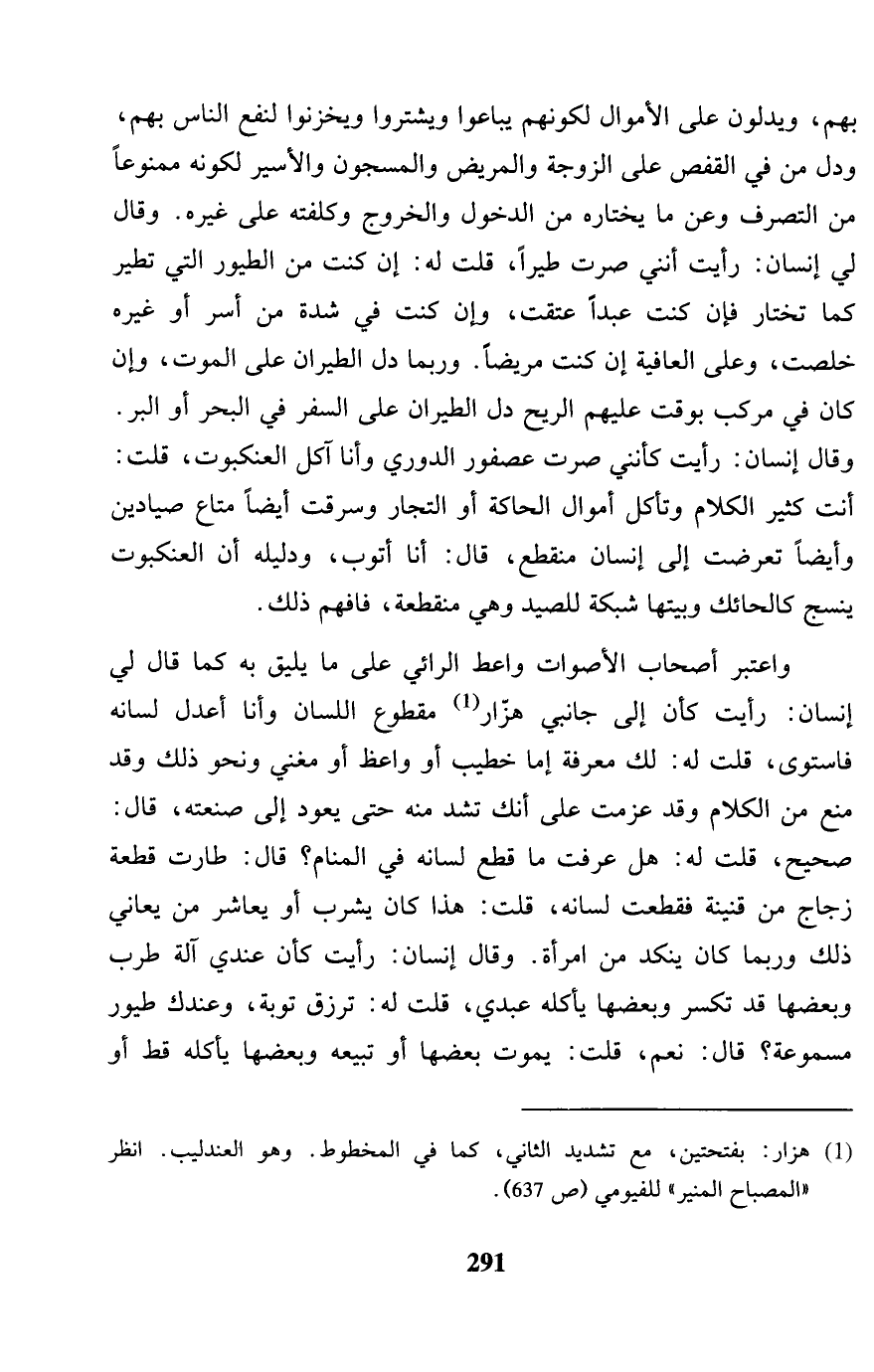 بهم، ويدلون على الْأَمْوَال لكَوْنهم يباعوا ويشتروا ويخزنوا لنفع النَّاس بهم، وَدلّ من فِي القفص على الزَّوْجَة وَالْمَرِيض والمسجون والأسير لكَونه مَمْنُوعًا من التَّصَرُّف وَعَن مَا يختاره من الدُّخُول وَالْخُرُوج وكلفته على غَيره. وَقَالَ لي إِنْسَان: رَأَيْت أنني صرت طيرا، قلت لَهُ: إِن كنت من الطُّيُور الَّتِي تطير كَمَا تخْتَار فَإِن كنت عبدا عتقت، وَإِن كنت فِي شدَّة من أسر أَو غَيره خلصت، وعَلى الْعَافِيَة إِن كنت مَرِيضا. وَرُبمَا دلّ الطيران على الْمَوْت، وَإِن كَانَ فِي مركب بِوَقْت عَلَيْهِم الرّيح دلّ الطيران على السّفر فِي الْبَحْر أَو الْبر. وَقَالَ إِنْسَان: رَأَيْت كأنني صرت عُصْفُور الدوري وَأَنا آكل العنكبوت، قلت: أَنْت كثير الْكَلَام وتأكل أَمْوَال الحاكة أَو التُّجَّار وسرقت أَيْضا مَتَاع صيادين وَأَيْضًا تعرضت إِلَى إِنْسَان مُنْقَطع، قَالَ: أَنا أَتُوب، وَدَلِيله أَن العنكبوت ينسج كالحائك وبيتها شبكة للصَّيْد وَهِي مُنْقَطِعَة، فَافْهَم ذَلِك. وَاعْتبر أَصْحَاب الْأَصْوَات واعط الرَّائِي على مَا يَلِيق بِهِ كَمَا قَالَ لي إِنْسَان: رَأَيْت كَأَن إِلَى جَانِبي هزار مَقْطُوع اللِّسَان وَأَنا أعدل لِسَانه فَاسْتَوَى، قلت لَهُ: لَك معرفَة إِمَّا خطيب أَو واعظ أَو مُغنِي وَنَحْو ذَلِك وَقد منع من الْكَلَام وَقد عزمت على أَنَّك تشد مِنْهُ حَتَّى يعود إِلَى صَنعته، قَالَ: صَحِيح، قلت لَهُ: هَل عرفت مَا قطع لِسَانه فِي الْمَنَام؟ قَالَ: طارت قِطْعَة زجاج من قنينة فَقطعت لِسَانه، قلت: هَذَا كَانَ يشرب أَو يعاشر من يعاني ذَلِك وَرُبمَا كَانَ ينكد من امْرَأَة. وَقَالَ إِنْسَان: رَأَيْت كَأَن عِنْدِي آلَة طرب وَبَعضهَا قد تكسر وَبَعضهَا يَأْكُلهُ عَبدِي، قلت لَهُ: ترزق تَوْبَة، وعندك طيور مسموعة؟ قَالَ: نعم، قلت: يَمُوت بَعْضهَا أَو تبيعه وَبَعضهَا يَأْكُلهُ قطّ أَو