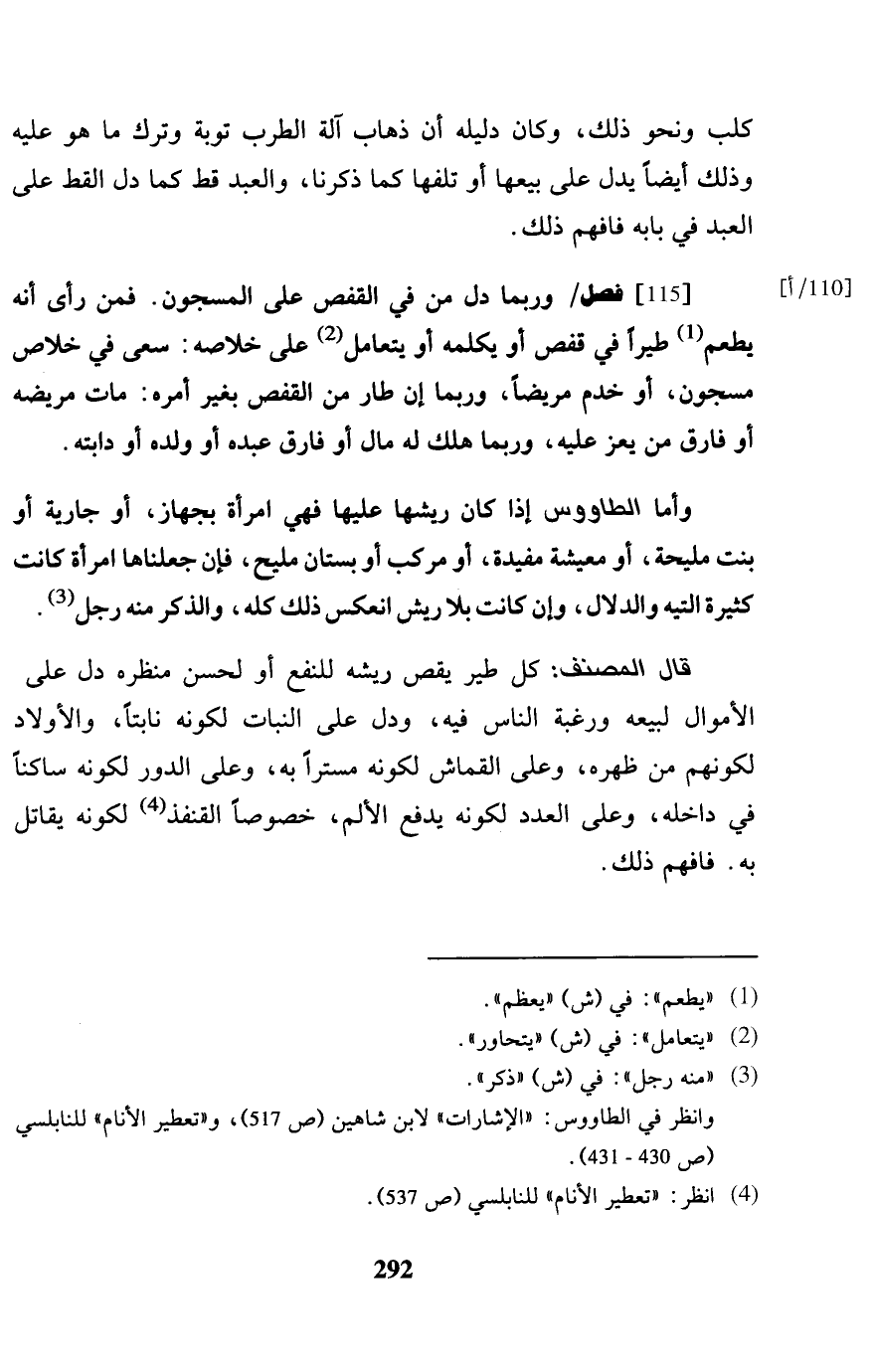 [115] فصل / وَرُبمَا دلّ من فِي القفص على المسجون. فَمن رأى أَنه يطعم طيرا فِي قفص أَو يكلمهُ أَو يتعامل على خلاصه: سعى فِي خلاص مسجون، أَو خدم مَرِيضا، وَرُبمَا إِن طَار من القفص بِغَيْر أمره: مَاتَ مريضه أَو فَارق من يعز عَلَيْهِ، وَرُبمَا هلك لَهُ مَال أَو فَارق عَبده أَو وَلَده أَو دَابَّته. وَأما الطاووس إِذا كَانَ ريشها عَلَيْهَا فَهِيَ امْرَأَة بجهاز، أَو جَارِيَة أَو بنت مليحة، أَو معيشة مفيدة، أَو مركب أَو بُسْتَان مليح، فَإِن جعلناها امْرَأَة كَانَت كَثِيرَة التيه والدلال، وَإِن كَانَت بِلَا ريش انعكس ذَلِك كُله، وَالذكر مِنْهُ رجل. قَالَ المُصَنّف: كل طير يقص ريشه للنفع أَو لحسن منظره دلّ على الْأَمْوَال لبيعه ورغبة النَّاس فِيهِ، وَدلّ على النَّبَات لكَونه نابتا، وَالْأَوْلَاد لكَوْنهم من ظَهره، وعَلى القماش لكَونه مسترا بِهِ، وعَلى الدّور لكَونه سَاكِنا فِي دَاخله، وعَلى الْعدَد لكَونه يدْفع الْأَلَم، خُصُوصا الْقُنْفُذ لكَونه يُقَاتل بِهِ. فَافْهَم ذَلِك.