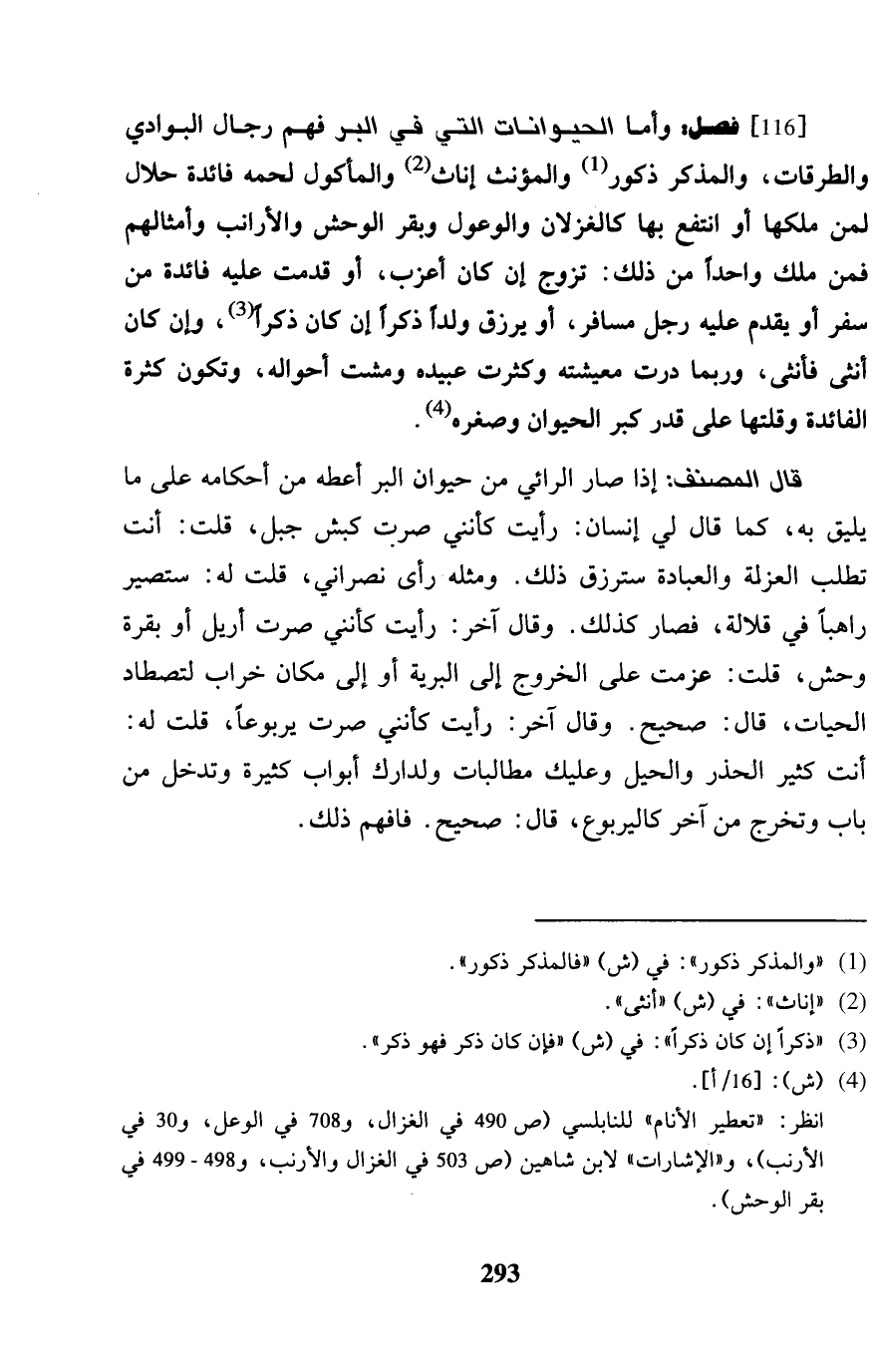 [116] فصل: وَأما الْحَيَوَانَات الَّتِي فِي الْبر فهم رجال الْبَوَادِي والطرقات، وَالْمَذْكُور ذُكُور والمؤنث إناث والمأكول لَحْمه فَائِدَة حَلَال لمن ملكهَا أَو انْتفع بهَا كالغزلان والوعول وبقر الْوَحْش والأرنب وأمثالهم فَمن ملك وَاحِدًا من ذَلِك: تزوج إِن كَانَ أعزب، أَو قدمت عَلَيْهِ فَائِدَة من سفر أَو يقدم عَلَيْهِ رجل مُسَافر، أَو يرْزق ولدا ذكرا إِن كَانَ ذكرا، وَإِن كَانَ أُنْثَى فأنثى، وَرُبمَا درت معيشته وَكَثُرت عبيده ومشت أَحْوَاله، وَتَكون كَثْرَة الْفَائِدَة وقلتها على قدر كبر الْحَيَوَان وصغره. قَالَ المُصَنّف: إِذا صَار الرَّائِي من حَيَوَان الْبر أعْطه من أَحْكَامه على مَا يَلِيق بِهِ، كَمَا قَالَ لي إِنْسَان: رَأَيْت كأنني صرت كَبْش جبل، قلت: أَنْت تطلب الْعُزْلَة وَالْعِبَادَة سترزق ذَلِك. وَمثله رأى نَصْرَانِيّ، قلت لَهُ: ستصير رَاهِبًا فِي قلالة، فَصَارَ كَذَلِك. وَقَالَ آخر: رَأَيْت كأنني صرت أريل أَو بقرة وَحش، قلت: عزمت على الْخُرُوج إِلَى الْبَريَّة أَو إِلَى مَكَان خراب لتصطاد الْحَيَّات، قَالَ: صَحِيح. وَقَالَ آخر: رَأَيْت كأنني صرت يربوعاً، قلت لَهُ: أَنْت كثير الحذر والحيل وَعَلَيْك مطالبات ولدارك أَبْوَاب كَثِيرَة وَتدْخل من بَاب وَتخرج من آخر كاليربوع، قَالَ: صَحِيح. فَافْهَم ذَلِك.