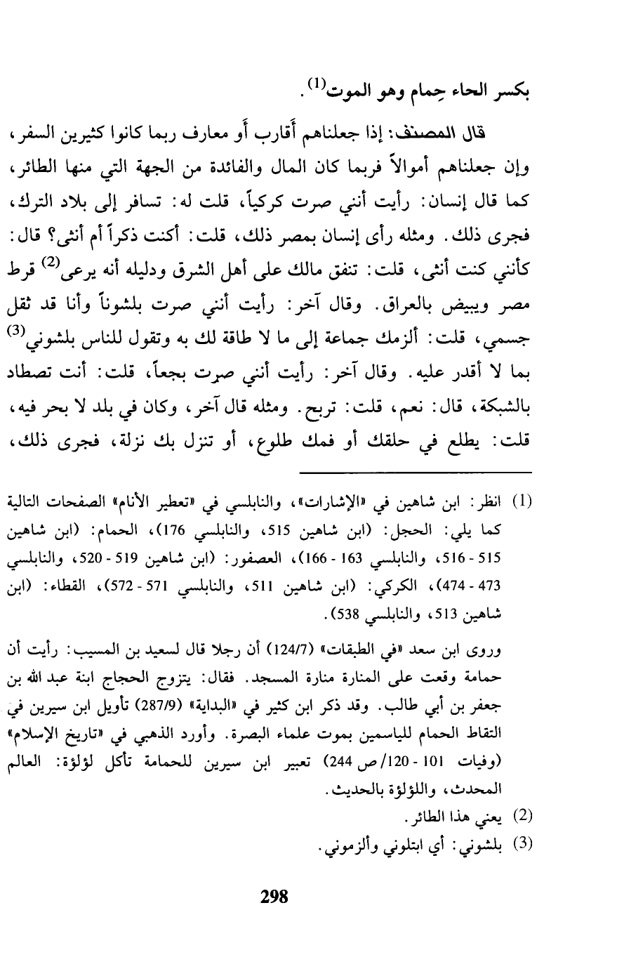 بِكَسْر الْحَاء حمام وَهُوَ الْمَوْت. قَالَ المُصَنّف: إِذا جعلناهم أقَارِب أَو معارف رُبمَا كَانُوا كثيرين السّفر، وَإِن جعلناهم أَمْوَالًا فَرُبمَا كَانَ المَال والفائدة من الْجِهَة الَّتِي طَار مِنْهَا الطَّائِر، كَمَا قَالَ إِنْسَان: رَأَيْت أنني صرت كركياً، قلت لَهُ: تُسَافِر إِلَى بِلَاد التّرْك، فَجرى ذَلِك. وَمثله رأى إِنْسَان بِمصْر ذَلِك، قلت: أَكنت ذكرا أم أُنْثَى؟ قَالَ: كأنني كنت أُنْثَى، قلت: تنْفق مَالك على أهل الشرق وَدَلِيله انه يرْعَى قرط مصر ويبيض بالعراق. وَقَالَ آخر: رَأَيْت أنني صرت بلشوناً وَأَنا قد ثقل جسمي، قلت: ألزمك جمَاعَة إِلَى مَا لَا طَاقَة لَك بِهِ وَتقول للنَّاس بلشوني بِمَا لَا اقدر عَلَيْهِ. وَقَالَ آخر: رَأَيْت أنني صرت بجعاً، قلت: أَنْت تصطاد بالشبكة، قَالَ: نعم، قلت: تربح. وَمثله قَالَ آخر، وَكَانَ فِي بلد لَا بَحر فِيهِ، قلت: يطلع فِي حلقك أَو فمك طُلُوع، أَو تنزل بك نزلة، فَجرى ذَلِك،