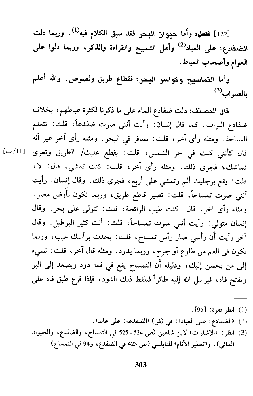 [122] فصل: وَأما حَيَوَان الْبَحْر فقد سبق الْكَلَام فِيهِ. وَرُبمَا دلّت الضفادع: على الْعباد وَأهل التَّسْبِيح وَالْقِرَاءَة وَالذكر، وَرُبمَا دلوا على الْعَوام وَأَصْحَاب العياط. وَأما التماسيح وكواسر الْبَحْر: فقطاع طَرِيق ولصوص. وَالله أعلم بِالصَّوَابِ. قَالَ المُصَنّف: دلّت ضفادع النَّاس على مَا ذكرنَا لِكَثْرَة عياطهم، بِخِلَاف ضفادع التُّرَاب. كَمَا قَالَ إِنْسَان: رَأَيْت أنني صرت ضفدعاً، قلت: تتعلم السباحة. وَمثله رأى آخر، قلت: تُسَافِر فِي الْبَحْر. وَمثله رأى آخر غير أَنه قَالَ كأنني كنت فِي حر الشَّمْس، قلت: يقطع عَلَيْك / الطَّرِيق وتعرى قماشك، فَجرى ذَلِك. وَمثله رأى آخر، قلت: كنت تمشي، قَالَ: لَا، قلت: يَقع بِرِجْلَيْك ألم وتمشي على أَربع، فَجرى ذَلِك. وَقَالَ إِنْسَان: رَأَيْت أنني صرت تمساحاً، قلت: تصير قَاطع طَرِيق، وَرُبمَا تكون بِأَرْض مصر. وَمثله رأى آخر، قَالَ: كنت طيب الرَّائِحَة، قلت: تتولى على الْبَحْر. وَقَالَ إِنْسَان مُتَوَلِّي: رَأَيْت أنني صرت تمساحاً، قلت: أَنْت كثير البرطيل. وَقَالَ آخر رَأَيْت أَن رَأْسِي صَار رَأس تمساح، قلت: يحدث برأسك عيب، وَرُبمَا يكون فِي لفم من طُلُوع أَو جرح، وَرُبمَا يدود. وَمثله قَالَ آخر، قلت: تسيء إِلَى من يحسن إِلَيْك، وَدَلِيله أَن التمساح يَقع فِي فَمه دود ويصعد إِلَى الْبر وَيفتح فَاه، فَيُرْسل الله إِلَيْهِ طائراً فيلقط ذَلِك الدُّود، فَإِذا فرغ طبق فَاه على