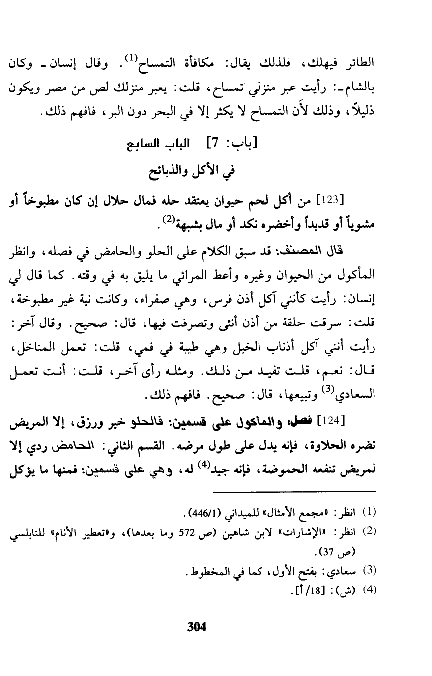 [123] من أكل لحم حَيَوَان يعْتَقد حلّه فَمَال حَلَال عَن كَانَ مطبوخاً أَو مشوياً أَو قديداً وأخضره نكد أَو مَال بِشُبْهَة. قَالَ المُصَنّف: قد سبق الْكَلَام على الحلو والحامض فِي فَصله، وانتظر الْمَأْكُول من الْحَيَوَان وَغَيره وَأعْطِ الْمرَائِي مَا يَلِيق بِهِ فِي وقته. كَمَا قَالَ لي إِنْسَان: رَأَيْت أنني آكل أذن فرس، وَهِي صفراء، وَكَانَت نِيَّة غير مطبوخة، قلت: سرقت حَلقَة من أذن أُنْثَى وتصرفت فِيهَا، قَالَ: صَحِيح. وَقَالَ آخر: رَأَيْت أنني آكل أَذْنَاب الْخَيل وَهِي طيبَة فِي فمي، قلت: تعلم المناخل، قَالَ: نعم، قلت تفِيد من ذَلِك. وَمثله رأى آخر، قلت: أَنْت تعلم السعادي وتبيعها، قَالَ: صَحِيح، فَافْهَم ذَلِك.