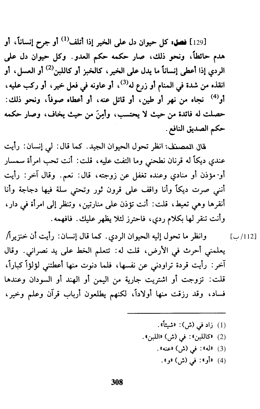 [129] فصل: كل حَيَوَان دلّ على خير إِذا اتلف أَو جرح إنْسَانا، أَو هدم حَائِطا، وَنَحْو ذَلِك، صَار حكمه حكم الْعَدو. وكل حَيَوَان دلّ على الردي إِذا أعْطى إنْسَانا مَا يدل على الْخَيْر، كالخبر أَو كاللبن أَو الْعَسَل، أَو انقذه من شدَّة فِي الْمَنَام أَو زرع لَهُ، أَو عاونه فِي فعل خير، أَو ركب عَلَيْهِ، أَو نجاه من نهر أَو طين، أَو قَاتل عَنهُ، أَو أعطَاهُ صُوفًا، وَنَحْو ذَلِك: حصلت لَهُ فَائِدَة من حَيْثُ لَا يحْتَسب، وَأمن من حَيْثُ يخَاف، وَصَارَ حكمه حكم الصّديق النافع. قَالَ المُصَنّف: انْظُر تحول الْحَيَوَان الْجيد. كَمَا قَالَ: لي إِنْسَان: رَأَيْت عِنْدِي ديكاً لَهُ قرنان نطحني وَمَا الْتفت عَلَيْهِ، قلت: أَنْت تحب امْرَأَة سمسار أَو مُؤذن أَو مُنَادِي وَعِنْده تغفل عَن زَوجته، قَالَ: نعم. وَقَالَ آخر: رَأَيْت أنني صرت ديكاً وَأَنا وَاقِف على قُرُون ثَوْر وتحتي سلة فِيهَا دجَاجَة وَأَنا أنقرها وَهِي تعيط، قلت: أَن تؤذن على منارتين، وَتنظر إِلَى امْرَأَة فِي دَار، وَأَنت تنقر لَهَا بِكَلَام ردي، فاحترز لِئَلَّا يظْهر عَلَيْك. فافهمه. وَانْظُر مَا تحول إِلَيْهِ حَيَوَان الردي. كَمَا قَالَ إِنْسَان: رَأَيْت أَن خنزيراً / يعلمني أحرث فِي الأَرْض، قلت لَهُ: تتعلم الْخط على يَد نَصْرَانِيّ. وَقَالَ آخر: رَأَيْت قردة تراودني عَن نَفسهَا، فَلَمَّا دَنَوْت مِنْهَا أعطتني لؤلؤاً كبارًا، قلت: تزوجت أَو اشْتريت جَارِيَة من الْيمن أَو الْهِنْد أَو السودَان وَعِنْدهَا فَسَاد، وَقد رزقت مِنْهَا أَوْلَادًا، لكِنهمْ يطلعون أَرْبَاب قُرْآن وَعلم وَخير،