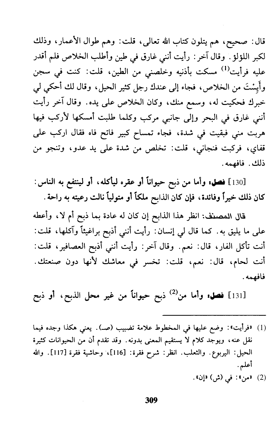 [130] فصل: وَأما من ذبح حَيَوَانا وعقره ليأكله، أَو لينْتَفع بِهِ النَّاس: كَانَ ذَلِك خيرا وَفَائِدَة، فَإِن كَانَ الذَّابِح ملكا أَو متوالياً نَالَتْ رَعيته بِهِ رَاحَة. قَالَ المُصَنّف: انْظُر هَذَا الذَّابِح إِن كَانَ لَهُ عَادَة بِمَا ذبح أَو لَا، وأعطه على مَا يَلِيق بِهِ. كَمَا قَالَ لي إِنْسَان: رَأَيْت أنني أذبح براغيثاً وآكلها، قلت: أَنْت تَأْكُل الفأر، قَالَ: نعم، وَقَالَ آخر: رَأَيْت أنني أذبح العصافير، قلت: أَنْت لحام، قَالَ: نعم، قلت: تخسر فِي معاشك لِأَنَّهَا دون صنعتك. فافهمه.