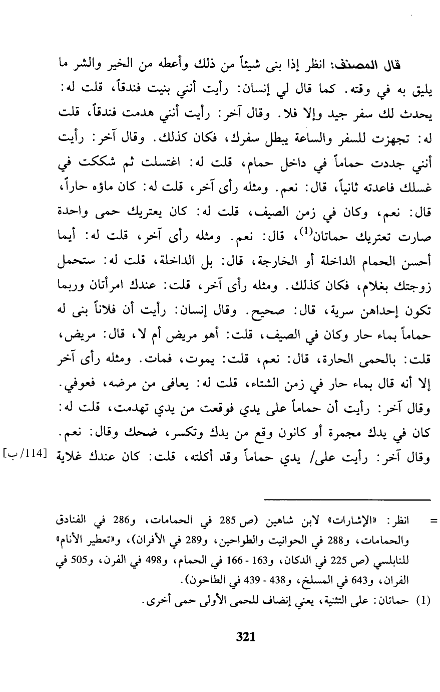 قَالَ المُصَنّف: انْظُر إِذا بنى شَيْئا من ذَلِك وأعطه من الْخَيْر وَالشَّر مل يَلِيق بِهِ فِي وقته. كَمَا قَالَ الْإِنْسَان: رَأَيْت أنني بنيت فندقاً، قلت لَهُ: يحدث لَك سفر جيد وَإِلَّا فَلَا. وَقَالَ آخر: رَأَيْت أنني هدمت فندقاً، قلت لَهُ: تجهزت للسَّفر والساعة يبطل سفرك، فَكَانَ كَذَلِك. وَقَالَ آخر: رَأَيْت أنني جددت حَماما فِي دَاخل حمام، قلت لَهُ: اغْتَسَلت ثمَّ شَككت فِي غسلك فاعدته ثَانِيًا، قَالَ: نعم، وَمثله رأى آخر، قلت لَهُ: كَانَ مَاؤُهُ حاراً، قَالَ: نعم، وَكَانَ فِي زمن الصَّيف، قلت لَهُ: كَانَ يعتريك حمى وَاحِدَة صَارَت تعتريك حماتان، قَالَ: نعم. وَمثله رأى آخر، قلت لَهُ: أَيّمَا أحسن الْحمام الدَّاخِلَة أَو الْخَارِجَة، قَالَ: بل الدَّاخِلَة، قلت لَهُ: ستحمل زَوجتك بِغُلَام، فَكَانَ كَذَلِك. وَمثله رأى آخر، قلت: عنْدك امْرَأَتَانِ وَرُبمَا تكون إِحْدَاهُنَّ سَرِيَّة، قَالَ: صَحِيح. وَقَالَ إِنْسَان: رَأَيْت أَن فلَانا بنى لَهُ حَماما بِمَاء حَار وَكَانَ فِي الصَّيف، قلت: أهوَ مَرِيض أم لَا، قَالَ: مَرِيض، قلت: بالحمى الحارة، قَالَ: نعم، قلت: يَمُوت، فَمَاتَ. وَمثله رأى آخر إِلَّا أَنه قَالَ بِمَاء حَار فِي زمن الشتَاء، قلت لَهُ: يعافى من مَرضه، فَعُوفِيَ. وَقَالَ آخر: رَأَيْت أَن حَماما على يَدي فَوَقَعت من يَدي تهدمت، قلت لَهُ: كَانَ فِي يدك مجمرة أَو كَانُوا وَقع من يدك وتكسر، ضحك وَقَالَ: نعم. وَقَالَ آخر: رَأَيْت على / يَدي حَماما وَقد أَكلته، قلت: كَانَ عِنْدِي غلاية