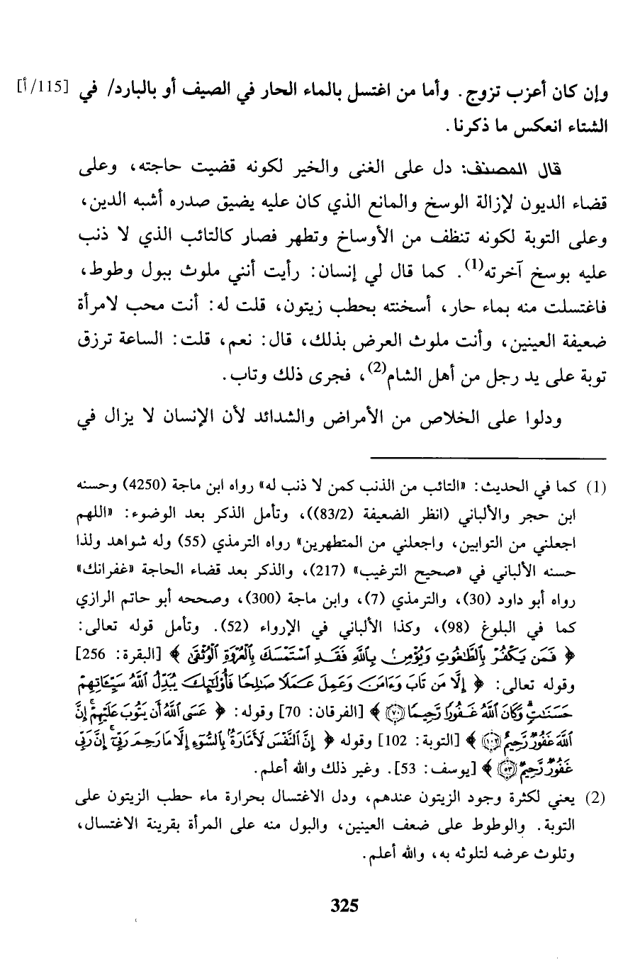 وَإِن كَانَ أعزب تزوج. وَأما من اغْتسل بِالْمَاءِ الْحَار فِي الصَّيف أَو بالبارد / فِي الشتَاء انعكس مَا ذكرنَا. قَالَ المُصَنّف: دلّ على الْغنى وَالْخَيْر لكَونه قضيت حَاجته، وعَلى قَضَاء الدُّيُون لإِزَالَة الْوَسخ الْمَانِع الَّذِي كَانَ عَلَيْهِ يضيق صَدره أشبه الدّين، وعَلى التَّوْبَة لكَونه تنظف من الأوساخ وتطهر فَصَارَ كالتائب الَّذِي لَا ذَنْب عَلَيْهِ بوسخ آخرته. كَمَا قَالَ لي إِنْسَان: رَأَيْت أنني ملوث ببول وطوط، فاغتسلت مِنْهُ بِمَاء حَار، أسخنته بحطب زيتون، قلت لَهُ: أَنْت محب لامْرَأَة ضَعِيفَة الْعَينَيْنِ، وَأَنت ملوث الْعرض بذلك، قَالَ: نعم، قلت: السَّاعَة ترزق تَوْبَة على يَد رجل من أهل الشَّام، فَجرى ذَلِك وَتَابَ. ودلوا على الْخَلَاص من الْأَمْرَاض والشدائد لِأَن الْإِنْسَان لَا يزَال فِي