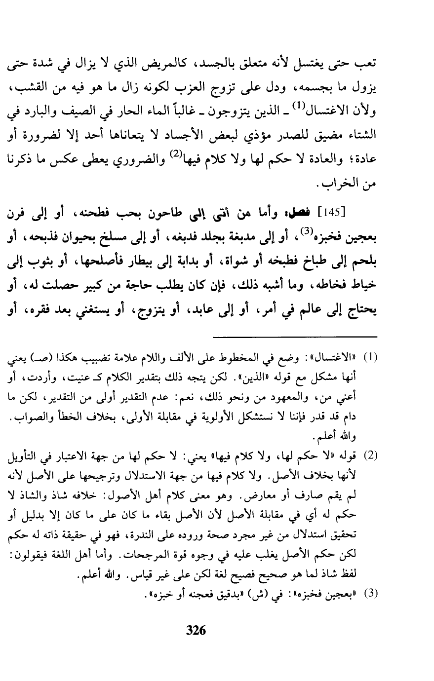 تَعب حَتَّى يغْتَسل لِأَنَّهُ مُتَعَلق بالجسد، كَالْمَرِيضِ الَّذِي لَا يزَال فِي شدَّة حَتَّى يَزُول مَا بجسمه، وَدلّ على تزوج العزب لكَونه زَالَ مَا هُوَ فِيهِ من القشب، وَلِأَن الِاغْتِسَال - الَّذين يَتَزَوَّجُونَ - غَالِبا المَاء الْحَار فِي الصَّيف والبارد فِي الشتَاء مضيق للصدر مؤذي لبعضا الأجساد لَا يتعاناها أحد إِلَّا لضَرُورَة أَو عَادَة؛ وَالْعَادَة لَا حكم لَهَا وَلَا كَلَام فِيهَا والضروري يُعْطي عكس مَا ذكرنَا من الخراب.
