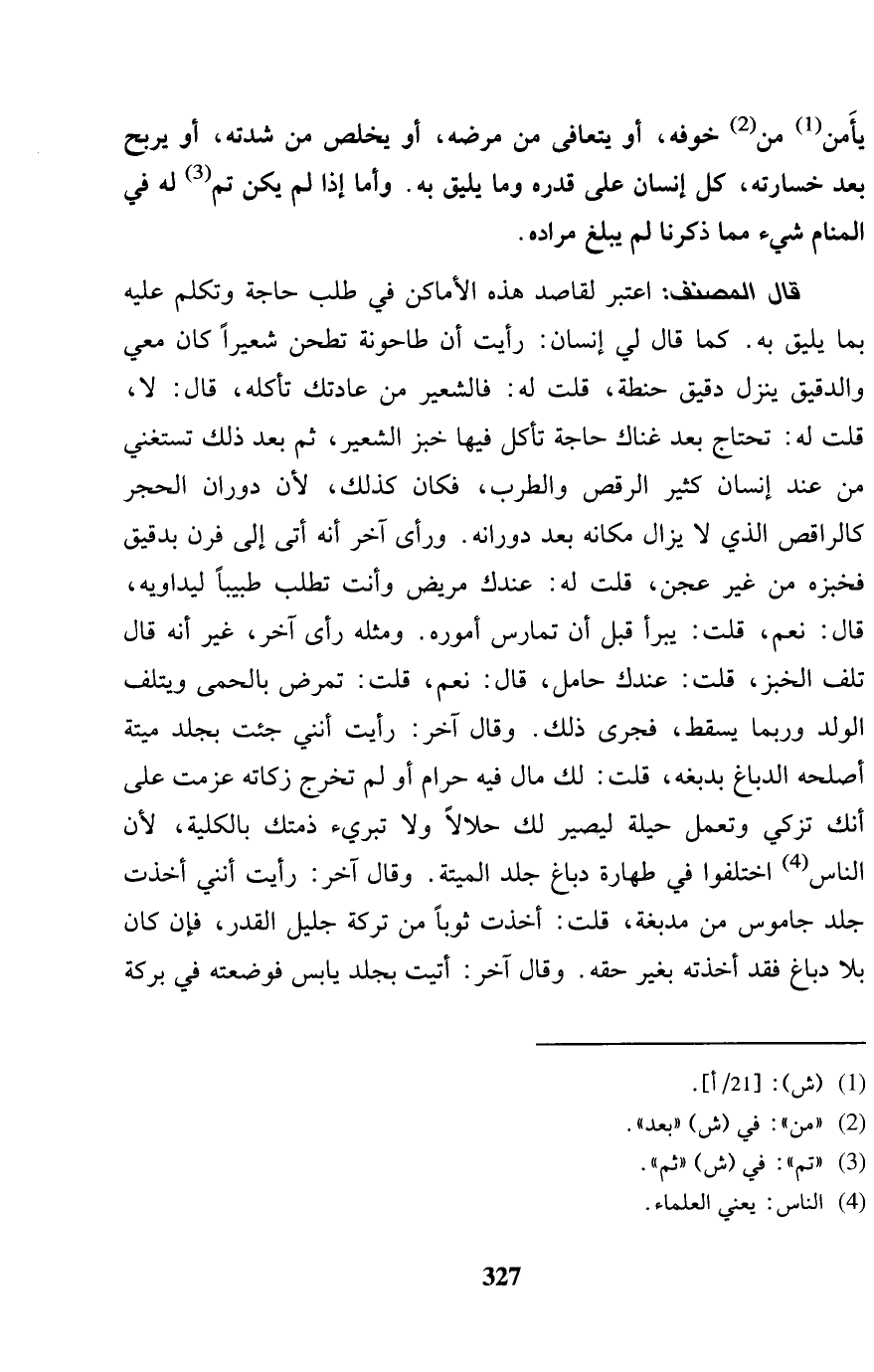 يَأْمَن من خَوفه، أَو يتعافى من مَرضه، أَو يخلص من شدته، أَو يربح بُد خسرته، كل إِنْسَان على قدره وَمَا يَلِيق بِهِ. وَأما إِذا لم يكن تمّ لَهُ فِي الْمَنَام شَيْء مِمَّا ذكرنَا لم يبلغ مُرَاده. قَالَ المُصَنّف: اعْتبر لقاصد هَذِه الْأَمَاكِن فِي طلب حَاجَة وَتكلم عَلَيْهِ بِمَا يَلِيق بِهِ. كَمَا قَالَ لي إِنْسَان: رَأَيْت أَن طاحونة تطحن شَعِيرًا كَانَ معي والدقيق ينزل دَقِيق حِنْطَة، قلت لَهُ: فالشعير من عادتك تَأْكُله، قَالَ: لَا، قلت لَهُ: تحْتَاج بعد غناك حَاجَة تَأْكُل فِيهَا خبز الشّعير، ثمَّ بعد ذَلِك تَسْتَغْنِي من عِنْد إِنْسَان كثير الرقص والطرب، فَكَانَ كَذَلِك، لِأَن دوران الْحجر كالراقص الَّذِي لَا يزل فِي مَكَانَهُ بعد دورانه. وَرَأى آخر أَنه أَتَى إِلَى فرن بدقيق فخبزه من غير عجن، قلت لَهُ: عنْدك مَرِيض وَأَنت تطلب طَبِيبا ليداويه، قَالَ: نعم، قلت: يبرأ قبل أَن تمارس أُمُوره. وَمثله رأى آخر، غير أَنه قَالَ تلف الْخبز، قلت: عنْدك حَامِل، قَالَ: نعم، قلت: تمرض بالحمى ويتلف الْوَلَد وَرُبمَا يسْقط، فَجرى ذَلِك. وَقَالَ آخر: رَأَيْت أنني جِئْت بجلد ميتَة أصلحه الدّباغ بدبغه، قلت: لَك مَال فِيهِ حرَام أَو لم تخرج زَكَاته عزمت على أَنَّك تزكي وتعمل حِيلَة ليصير لَك حَلَالا وَلَا تبرئ ذِمَّتك بِالْكُلِّيَّةِ، لِأَن النَّاس اخْتلفُوا فِي طَهَارَة دباغ جلد الْميتَة. وَقَالَ آخر: رَأَيْت أنني أخذت جلد جاموس من مدبغة، قلت: أخذت ثوبا من تَرِكَة جليل الْقدر، فَإِن كَانَ بِلَا دباغ فقد أَخَذته بِغَيْر حَقه. وَقَالَ آخر: أتيت بجلد يَابِس فَوَضَعته فِي بركَة