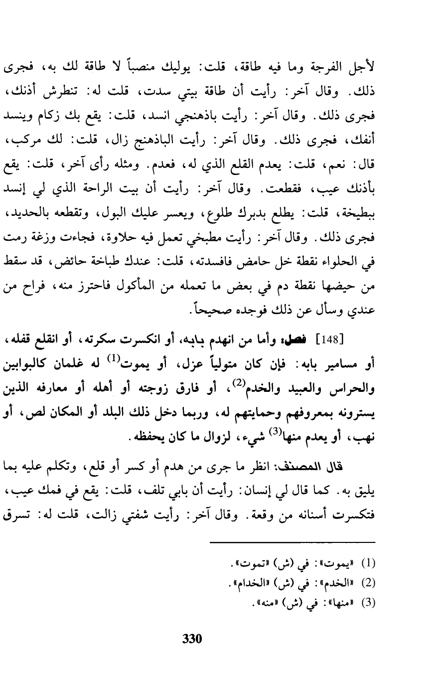 [148] فصل: وَأما من انهد بَابه، أَو انْكَسَرت سكرته، أَو انقلع قفله، أَو مسامير بَابه: فَإِن كَانَ مُتَوَلِّيًا عزل، أَو يَمُوت لَهُ غلْمَان كالبوابين والحراس وَالْعَبِيد والخدم، أَو فَارق زَوجته أَو أَهله أَو معارفه الَّذين يسترونه بمعرفتهم وحمايتهم لَهُ، وَرُبمَا دخل ذَلِك الْبَلَد أَو الْمَكَان لص، أَو نهب، أَو يعْدم مِنْهَا شَيْء، لزوَال مَا كَانَ يحفظه. قَالَ المُصَنّف: انْظُر مَا جرى من هدم أَو كسر أَو قلع، وَتكلم عَلَيْهِ بِمَا يَلِيق بِهِ. كَمَا قَالَ لي إِنْسَان: رَأَيْت أَن بَابي تلف، قلت: يَقع فِي فمك عيب، فتكسرت أَسْنَانه من وقْعَة. وَقَالَ آخر: رَأَيْت شفتي زَالَت، قلت لَهُ: تسرق