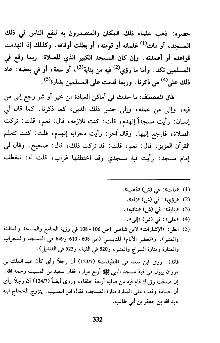 حصره: ذهب عُلَمَاء ذَلِك الْمَكَان والمتصدرون بِهِ لنفع النَّاس فِي ذَلِك الْمَسْجِد، أَو مَاتَ غلمانه أَو قومته، أَو بطلت أوقافه. وَكَذَلِكَ إِذا انْهَدَمت قَوَاعِده أَو أعمدته. وَإِن كَانَ الْمَسْجِد الْكَبِير الَّذِي للصَّلَاة: رُبمَا وَقع فِي المسلين نكد. وَأما مَا رُؤِيَ فِيهِ من بناية، أَو سَعَة، أَو فِي بعضه: عَاد ذَلِك على من ذكرنَا. وَرُبمَا قدمت على الْمُسلمين بِشَارَة. قَالَ المُصَنّف: مَا حدث فِي أَمَاكِن الْعِبَادَة من خير أَو شَرّ رَجَعَ إِلَى من فِيهِ، وَإِلَى من علمه، وَإِلَى جنس ذَلِك الدّين، كَمَا ذكرنَا، كَمَا قَالَ لي إِنْسَان: رَأَيْت مَسْجِدا إنهدم، قلت: كنت تلازمه، قَالَ: نعم، قلت: تركت الصَّلَاة، فَارْجِع إِلَيْهَا. وَقَالَ آخر: رَأَيْت محرابه انْهَدم، قلت: كنت تتعلم الْقُرْآن الْعَزِيز، قَالَ: نعم، قلت: قد تركت ذَلِك، قَالَ: صَحِيح. وَقَالَ لي إِمَام مَسْجِد: رَأَيْت قبَّة مَسْجِدي وَقد اختطفها غراب، قلت لَهُ: تخطف