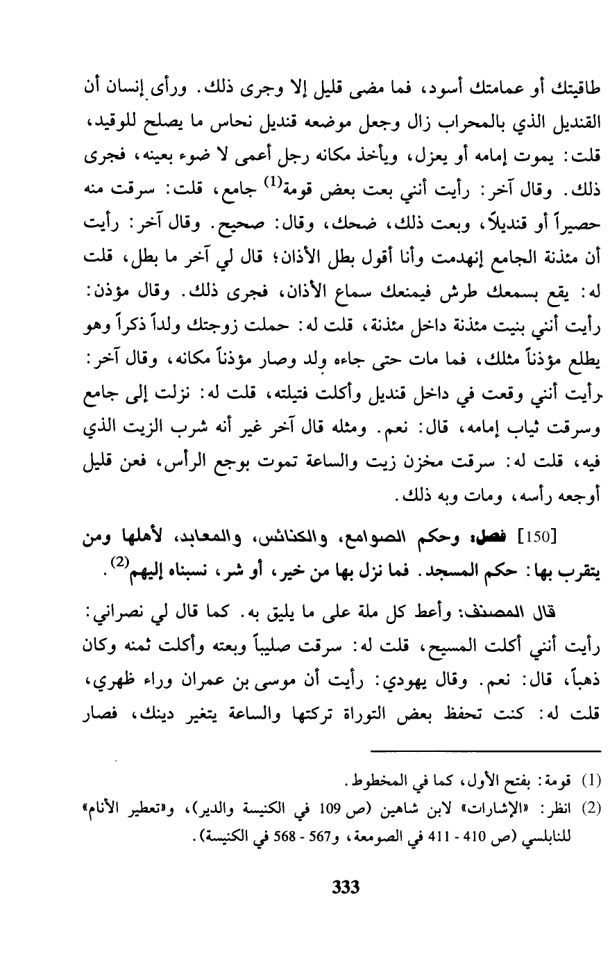 [150] فصل: وَحكم الصوامع وَالْكَنَائِس والمعابد، لأَهْلهَا وَمن يقرب بهَا: حكم الْمَسْجِد. فَمَا نزل بهَا من خير، أَو شَرّ، نسبناه إِلَيْهِم. قَالَ المُصَنّف: وَأعْطِ كل مِلَّة على مَا يَلِيق بِهِ. كَمَا قَالَ لي نَصْرَانِيّ: رَأَيْت أنني أكلت الْمَسِيح، قلت لَهُ: سرقت صليباً وبعته وأكلت ثمنه وَكَانَ ذَهَبا، قَالَ: نعم، وَقَالَ الْيَهُودِيّ: رَأَيْت أَن مُوسَى بن عمرَان وَرَاء ظَهْري، قلت لَهُ: كنت تحفظ بعض التَّوْرَاة تركتهَا والساعة يتَغَيَّر دينك، فَصَارَ