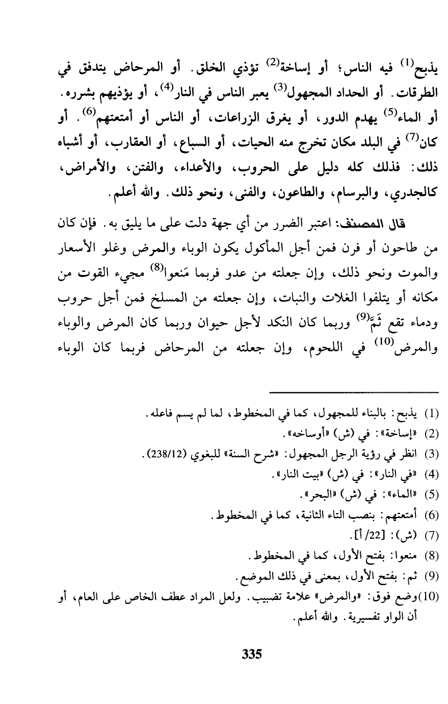 يذبح فِيهِ النَّاس، أَو إساخة تؤذي الْخلق. أَو المرحاض يتدفق فِي الطرقات. أَو الْحداد الْمَجْهُول يعبر النَّاس فِي النَّار، أَو يؤذيهم بشرره. أَو المَاء يهدم الدّور، أَو يغرق الزرعات، أَو النَّاس أَو أمتعتهم. أَو كَانَ فِي الْبَلَد مَكَان تخرج مِنْهُ الْحَيَّات، أَو السبَاع، أَو العقارب، أَو أشباه ذَلِك: فَذَلِك كُله دَلِيل على الحروب، والأعداء والفتن، والأمراض، كالجدري، والبراسام، والطاعون، والفنى، وَنَحْو ذَلِك. وَالله أعلم. قَالَ المُصَنّف: اعْتبر الضَّرَر من أَي جِهَة دلّت على مَا يَلِيق بِهِ. فَإِن كَانَ من طاحون أَو فرن فَمن أجل الْمَأْكُول يكون الوباء وَالْمَرَض وغلو الأسعار وَالْمَوْت وَنَحْو ذَلِك، وَإِن جعلته من عَدو فَرُبمَا منعُوا مَجِيء الْقُوت من مَكَانَهُ أَو يتلفوا الغلات والنبات، وَإِن جعلته من المسلخ فَمن أجل حروب وَدِمَاء تقع ثمَّ وَرُبمَا كَانَ النكد لأجل حَيَوَان وَرُبمَا كَانَ الْمَرَض والوباء وَالْمَرَض فِي اللحوم، وَإِن جعلته من المرحاض فَرُبمَا كَانَ الوباء