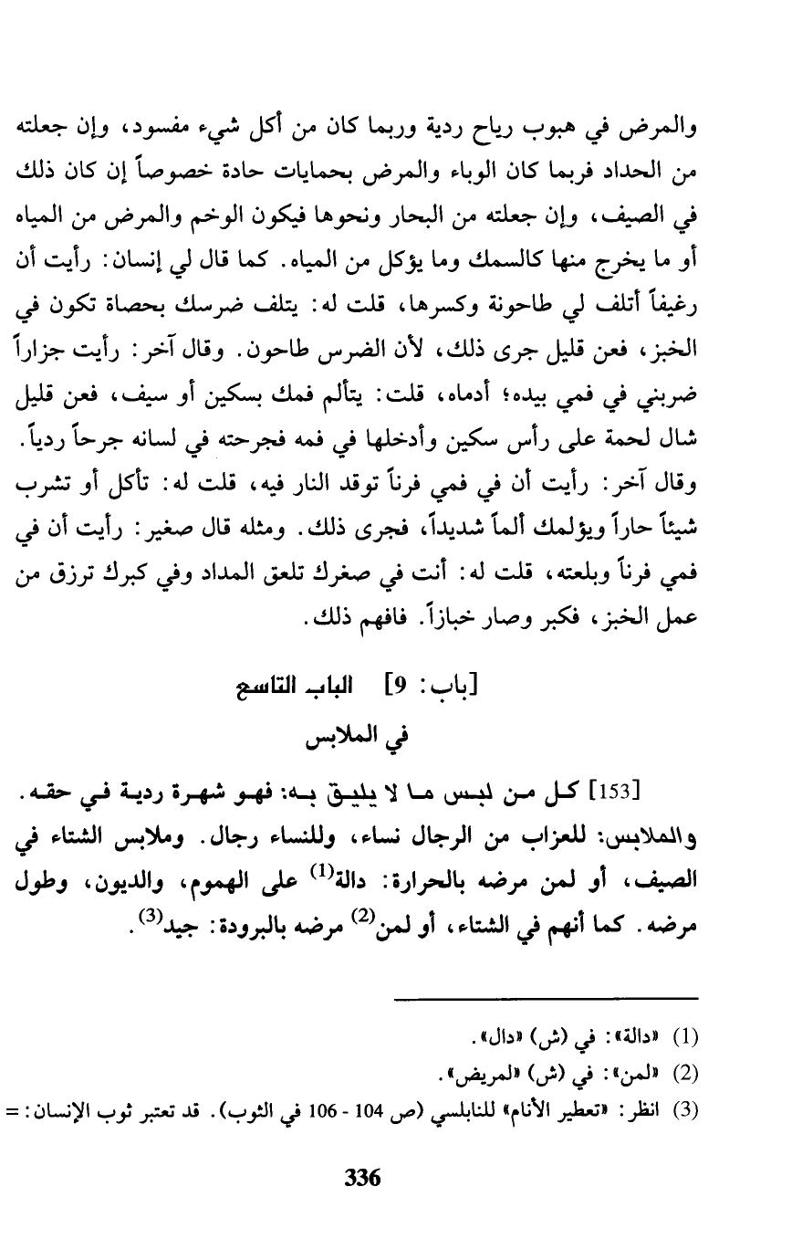 [153] كل من لبس مَا لَا يَلِيق بِهِ: فَهُوَ شهرة ردية فِي حَقه. والملابس: للعزاب من الرِّجَال نسَاء، وَلِلنَّاسِ رجال. وملابس الشتَاء فِي الصَّيف، أَو لمن مَرضه بالحرارة: دَالَّة على الهموم، والديون، وَطول مَرضه. كَمَا أَنهم فِي الشتَاء، أَو لمن مَرضه بالبرودة: جيد.