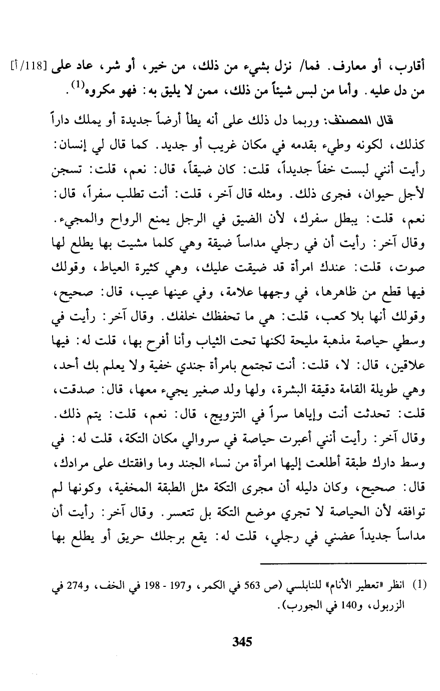 أقَارِب، أَو معارف. فَمَا / نزل بِشَيْء من ذَلِك، من خير، أَو شَرّ، عَاد عِلّة من دلّ عَلَيْهِ. وَأما من لبس شَيْئا من ذَلِك، مِمَّن يَلِيق بِهِ: فَهُوَ مَكْرُوه. قَالَ المُصَنّف: وَرُبمَا دلّ ذَلِك على أَنه يطَأ أَرضًا جَدِيدَة أَو يملك دَارا كَذَلِك، لكَونه وطيء بقدمه فِي مَكَان غَرِيب أَو جَدِيد. كَمَا قَالَ لي إِنْسَان: رَأَيْت أنني لبست خفاً جَدِيدا، قلت: كَانَ ضيقا، قَالَ: نعم، قلت: تسجن لأجل حَيَوَان، فَجرى ذَلِك. وَمثله قَالَ آخر: قلت: أَنْت تطلب سفرا، قَالَ: نعم، قلت: يبطل سفرك، لِأَن الضّيق فِي الرجل يمْنَع الرواح والمجيء. وَقَالَ آخر: رَأَيْت أَن فِي رجْلي مداساً ضيقَة وَهِي كلما مشيت بهَا يطلع لَهَا صَوت، قلت: عنْدك امْرَأَة قد ضيقت عَلَيْك، وَهِي كَثِيرَة العياط، وقولك فِيهَا قَاطع من ظَاهرهَا، فِي وَجههَا عَلامَة، وَفِي عينهَا عيب، قَالَ: صَحِيح، وقولك أَنَّهَا بِلَا كَعْب، قلت: هِيَ مَا تحفظك خَلفك. وَقَالَ آخر: رَأَيْت فِي وسطي حياصة مذهبَة مليحة لَكِنَّهَا تَحت الثِّيَاب وَأَنا أفرح بهَا، قلت لَهُ: فِيهَا علاقين، قَالَ: لَا، قلت: أَنْت تَجْتَمِع بِامْرَأَة جندي خُفْيَة وَلَا يعلم بك أحد، وَهِي طَوِيلَة الْقَامَة دقيقة الْبشرَة، وَلها ولد صَغِير يَجِيء مَعهَا، قَالَ: صدقت، قلت: تحدثت أَنْت وَإِيَّاهَا سرا فِي التَّزْوِيج، قَالَ: نعم، قلت: يتم ذَلِك. وَقَالَ آخر: رَأَيْت أنني أعبرت حياصة فِي سروالي مَكَان التكة، قلت لَهُ: فِي وسط دَارك طبقَة أطلعت إِلَيْهَا امْرَأَة من نسَاء الْجند وَمَا وافقتك على مرادك، قَالَ: صَحِيح، وَكَانَ دَلِيله أَن مجْرى التكة مثل الطَّبَقَة المخفية، وَكَونهَا لم توافقه لِأَن الحياصة لَا تجْرِي مَوضِع التكة بل تتعسر. وَقَالَ آخر: رَأَيْت أَن مداساً جَدِيدا عضني فِي رجْلي، قلت لَهُ: يَقع برجلك حريق أَو يطلع بهَا