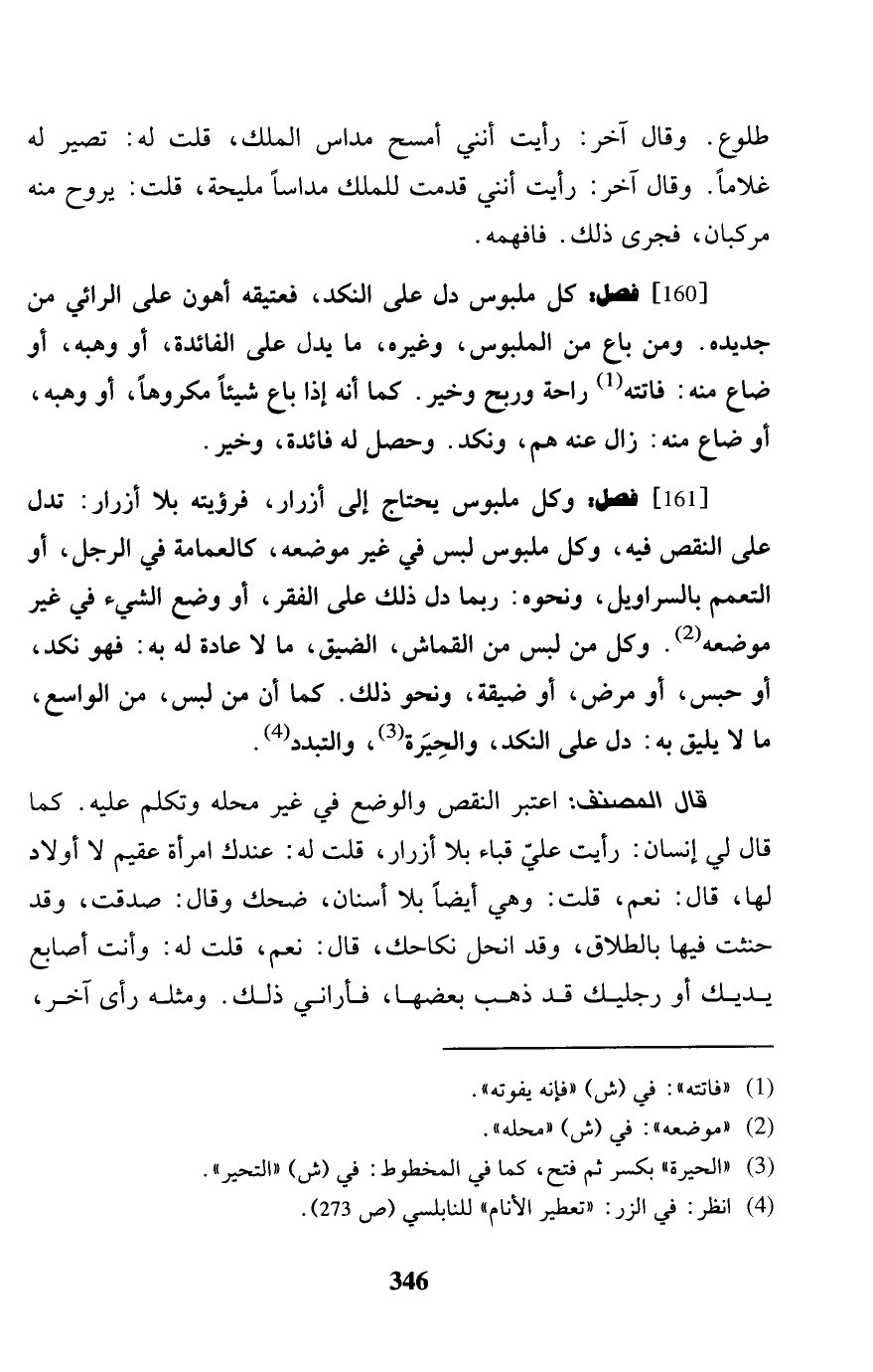 [160] فصل: كل ملبوس دلّ على نكد، فعتيقه أَهْون على الرَّائِي من جديده. وَمن بَاعَ من الملبوس، وَغَيره، مَا يدل على الْفَائِدَة، أَو وهبه، أَو ضَاعَ مِنْهُ: فَاتَتْهُ رَاحَة وَربح وَخير. كَمَا أَنه إِذا بَاعَ شَيْئا مَكْرُوها، أَو وهبه، أَو ضَاعَ مِنْهُ: زَالَ عَنهُ هم، ونكد. وَحصل لَهُ فَائِدَة، وَخير.