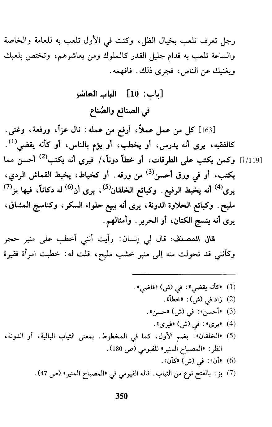 [163] كل من عمل عملا، أرفع من عمله: نَالَ عزا، ورفعة، وغنى. كالفقيه، يرى أَنه يدرس، أَو يخْطب، أَو يؤم بِالنَّاسِ، أَو كَأَنَّهُ يقْضِي. وَكَمن يكْتب على الطرقات، أَو خطا دوناً، / فَيرى أَنه يكْتب أحسن مِمَّا يكْتب، أَو فِي ورق أحسن من روقه. أَو كخياط، يخيط القماش الردي، يرى أَنه يخيط الرفيع. وكبائع الخلقان، يرى أَن لَهُ دكاناً، فِيهَا بز مليح. وكبائع الْحَلَاوَة الدونة، يرى أَنه يَبِيع حلواء السِّرّ، وكناسج المشاق، يرى أَنه ينسج الْكَتَّان، أَو الْحَرِير. وأمثالهم. قَالَ المُصَنّف: قَالَ لي إِنْسَان: رَأَيْت أنني أَخطب على مِنْبَر حجر وكأنني قد تحولت مِنْهُ إِلَى مِنْبَر خشب مليح، قلت لَهُ: خطبت امْرَأَة فقيرة