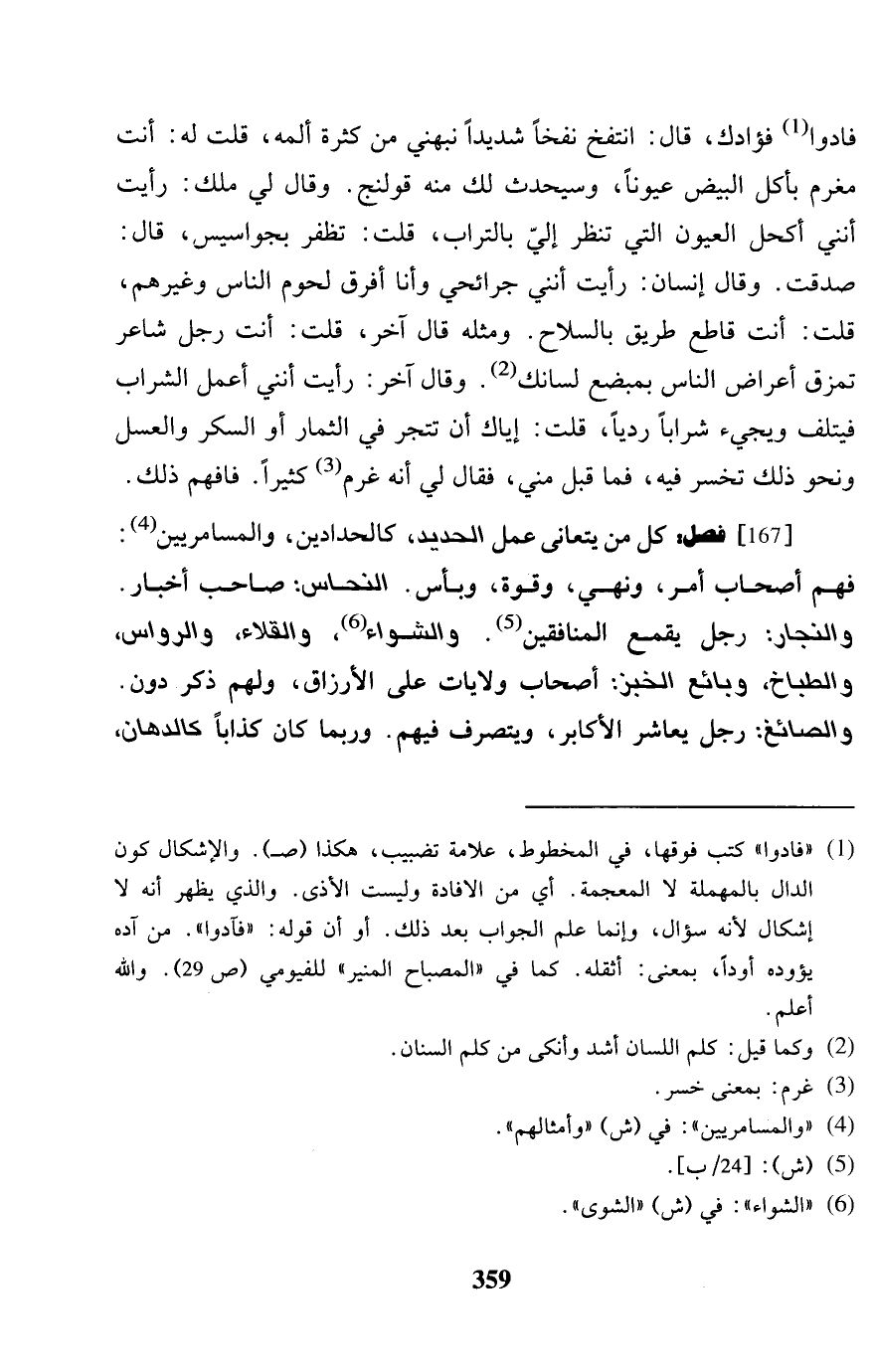 [167] فصل: كل من يتعانى عمل الْحَدِيد، كالحدادين، والمسامريين: فهم أَصْحَاب أَمر، وَنهي وَقُوَّة، وبأس. والنحاس: صَاحب أَخْبَار. والنجار: رجل يقمع الْمُنَافِقين. والشواء، والقلاء، والرواس، والطباخ، وبائع الْخبز: أَصْحَاب ولايات على الأرزاق، وَلَهُم ذكر دون. الصَّائِغ: رجل يعاشر الأكابر، ويتصرف فيهم. وَرُبمَا كَانَ كذابا كالدهان،