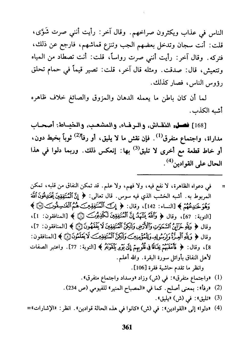 [168] فصل: النقاش، والرفاء، والمشعب، والخياط: أَصْحَاب مداراة، واجتماع متفرق. فَإِن نقش مَا لَا يَلِيق، أَو رفأ ثوبا بخيط دون، أَو خاط قِطْعَة مَعَ أُخْرَى لَا تلِيق بهَا: إنعكس ذَلِك. وَرُبمَا دلوا فِي هَذَا الْحَال على القوادين.