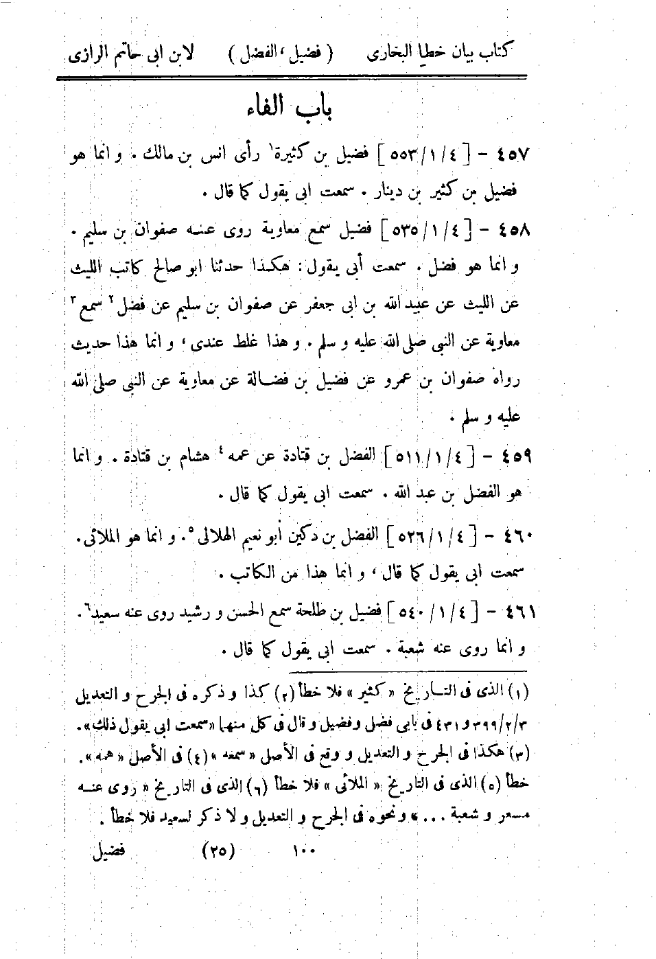 (1) الذى في التاريخ " كثير " فلا خطأ (2) كذا وذكره في الجرح والتعديل 3 / 2 / 399 و 431 في بابى فضل وفضيل وقال في كل منهما " سمعت ابى يقول ذلك ".