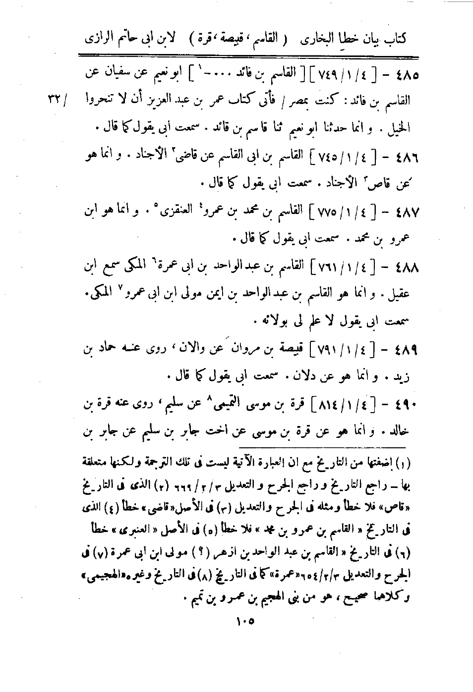 (1) اضفتها من التاريخ مع ان العبارة الآتية ليست في تلك الترجمة ولكنها متعلقة بها - راجع التاريخ وراجع الجرح والتعديل 3 / 2 / 669 (2) الذى في التاريخ " قاص " فلا خطأ ومثله في الجرح والتعديل (3) في الاصل " قاضى " خطأ (4) الذى في التاريخ " القاسم بن عمرو بن محمد " فلا خطأ (5) في الاصل " العنبري " خطأ (6) في التاريخ " القاسم بن عبد الواحد بن ازهر (؟) مولى ابن ابى عمرة (7) في الجرح والتعديل 3 / 2 / 654 " عمرة " كما في التاريخ (8) في التاريخ وغيره " الهجيمى " وكلاهما صحيح، هو من بنى الهجيم بن عمرو بن تميم.
