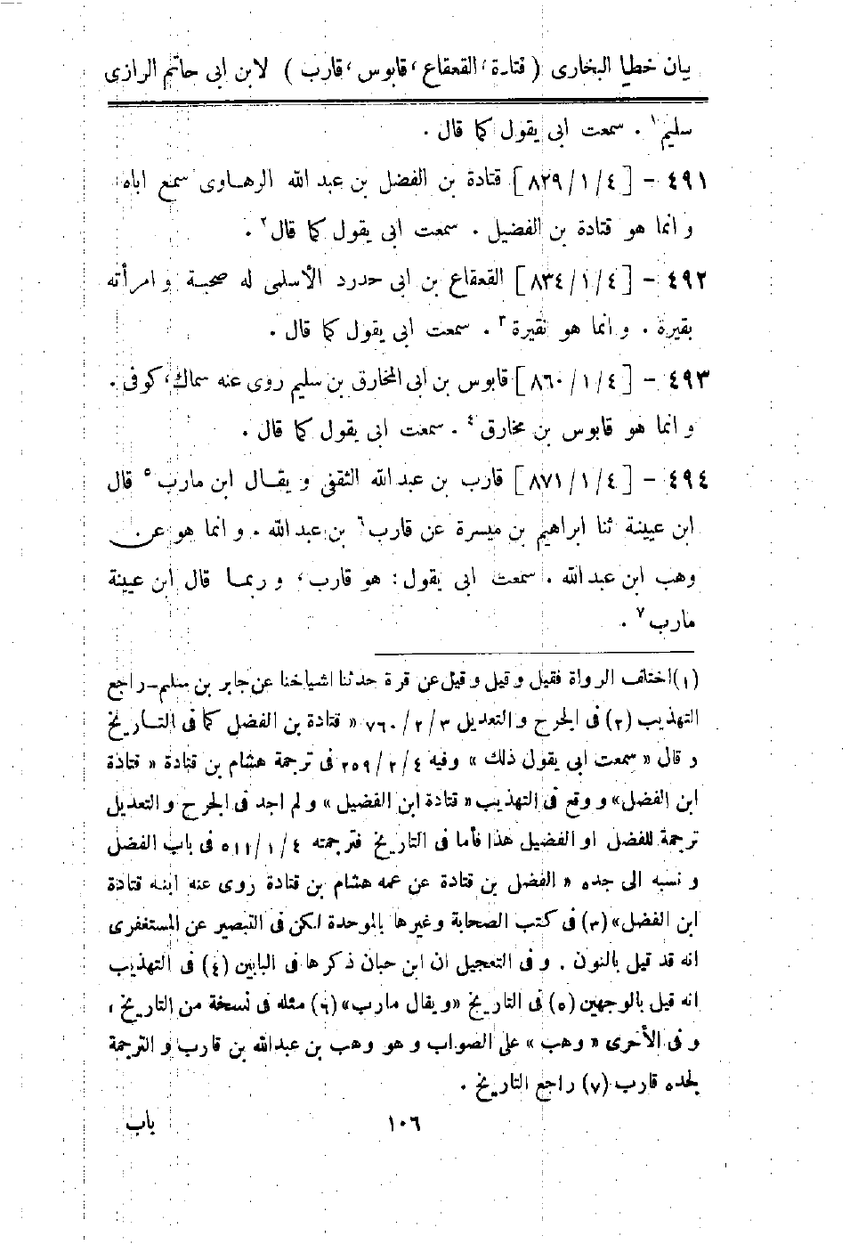 (1) اختلف الرواة فقيل وقيل وقيل عن قرة حدثنا اشياخنا عن جابر بن سلم - راجع التهذيب (2) في الجرح والتعديل 3 / 2 / 760 " قتادة بن الفضل كما في التاريخ وقال " سمعت ابى يقول ذلك " وفيه 4 / 2 / 259 في ترجمة هشام بن قتادة " قتادة ابن الفضل " ووقع في التهذيب " قتادة ابن الفضيل " ولم اجد في الجرح والتعديل ترجمة للفضل أو الفضيل هذا فأما في التاريخ فترجمته 4 / 1 / 511 في باب الفضل ونسبه إلى جده " الفضل بن قتادة عن عمه هشام بن قتادة روى عنه ابنه قتادة ابن الفضل " (3) في كتب الصحابة وغيرها بالموحدة لكن في التبصير عن المستغفرى انه قد قيل بالنون.