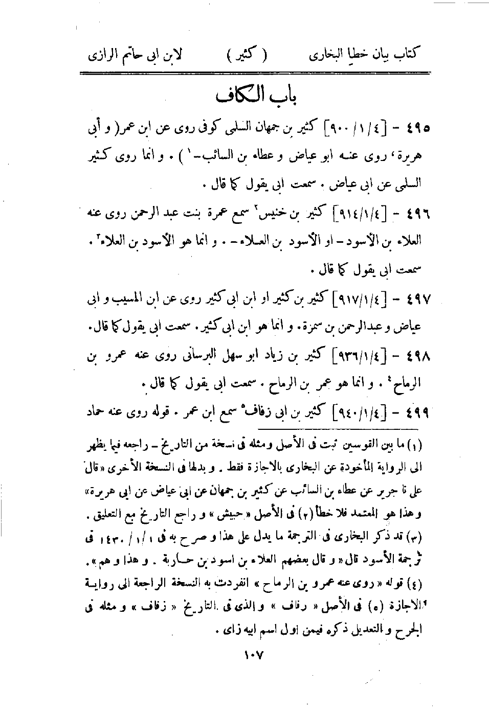 باب الكاف 495 -[4 / 1 / 900] كثير بن جمهان السلمى كوفى روى عن ابن عمر (وأبى هريرة، روى عنه أبو عياض وعطاء بن السائب - (1)) .