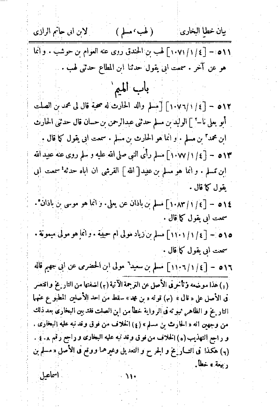(1) هذا موضعه وتأخر في الاصل عن الترجمة الآتية (2) اضفتها من التاريخ واقتصر في الاصل على " قال " (3) قوله " بن محمد " سقط من احد الاصلين المطبوع عنهما التاريخ والظاهر ثبوته في الرواية خطأ من ابن الصلت فقد بين البخاري بعد ذلك من وجهين انه " الحارث بن مسلم " (4) الخلاف من فوق وقد نبه عليه البخاري.