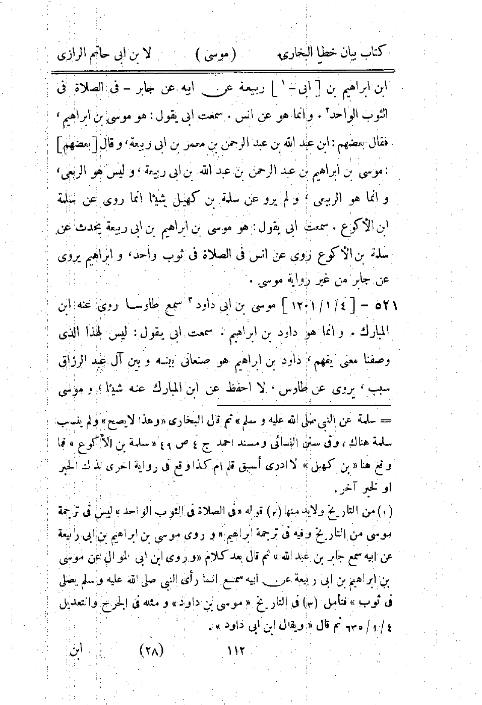 (1) من التاريخ ولابد منها (2) قوله " في الصلاة في الثوب الواحد " ليس في ترجمة موسى من التاريخ وفيه في ترجمة ابراهيم " وروى موسى بن ابراهيم بن ابى ربيعة عن ابيه سمع جابر بن عبد الله " ثم قال بعد كلام " وروى ابن ابى الموال عن موسى ابن ابراهيم بن ابى ربيعة عن ابيه سمع انسا رأى النبي صلى الله عليه وسلم يصلى في ثوب " فتأمل (3) في التاريخ " موسى بن داود " ومثله في الجرح والتعديل 4 / 1 / 635 ثم قال " ويقال ابن ابى داود ".