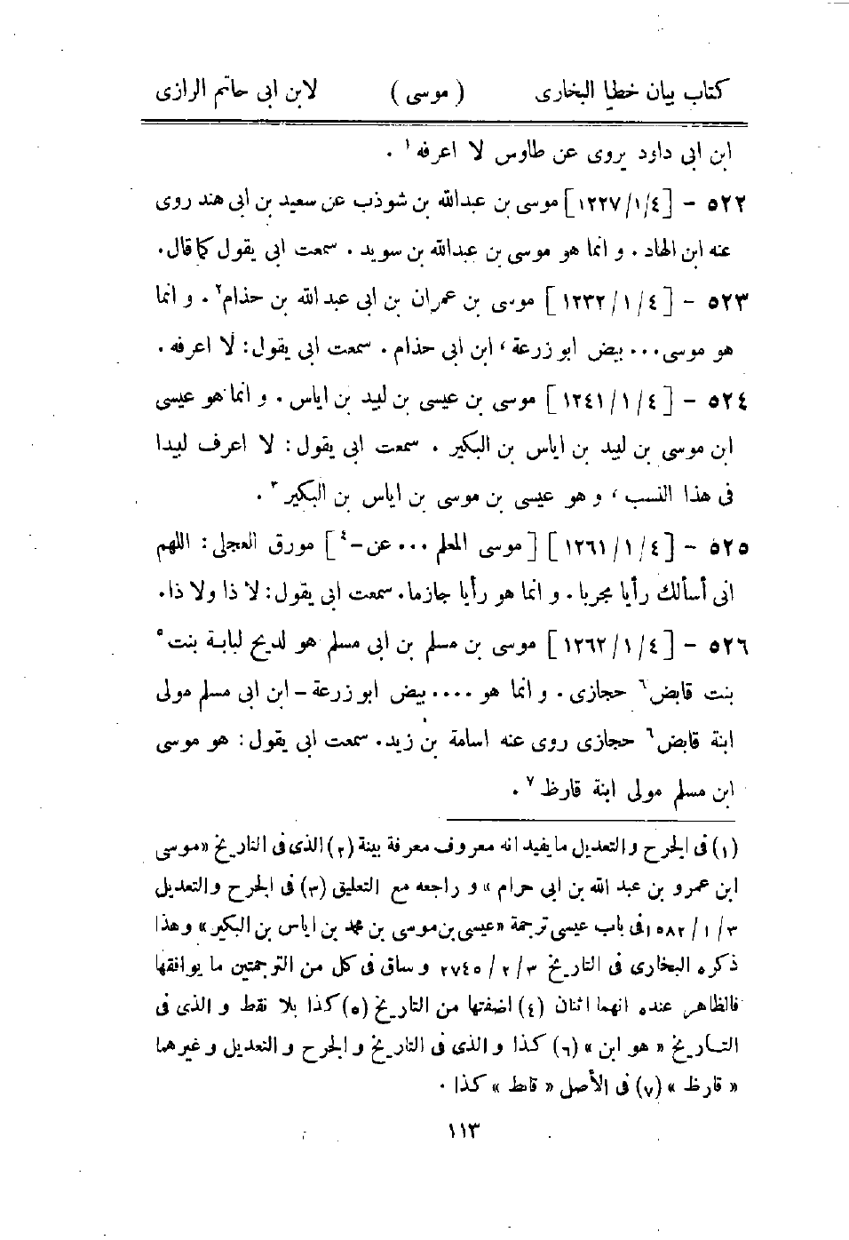 (1) في الجرح والتعديل ما يفيد انه معروف معرفة بينة (2) الذى في التاريخ " موسى ابن عمرو بن عبد الله بن ابى حرام " وراجعه مع التعليق (3) في الجرح والتعديل 3 / 1 / 1582 في باب عيسى ترجمة " عيسى بن موسى بن محمد بن اياس بن البكير " وهذا ذكره البخاري في التاريخ 3 / 2 / 2745 وساق في كل من الترجمتين ما يوافقها فالظاهر عنده انهما اثنان (4) اضفتها من التاريخ (5) كذا بلا نقط والذى في التاريخ " هو ابن " (6) كذا والذى في التاريخ والجرح والتعديل وغيرهما " قارظ " (7) في الاصل " قابط " كذا.