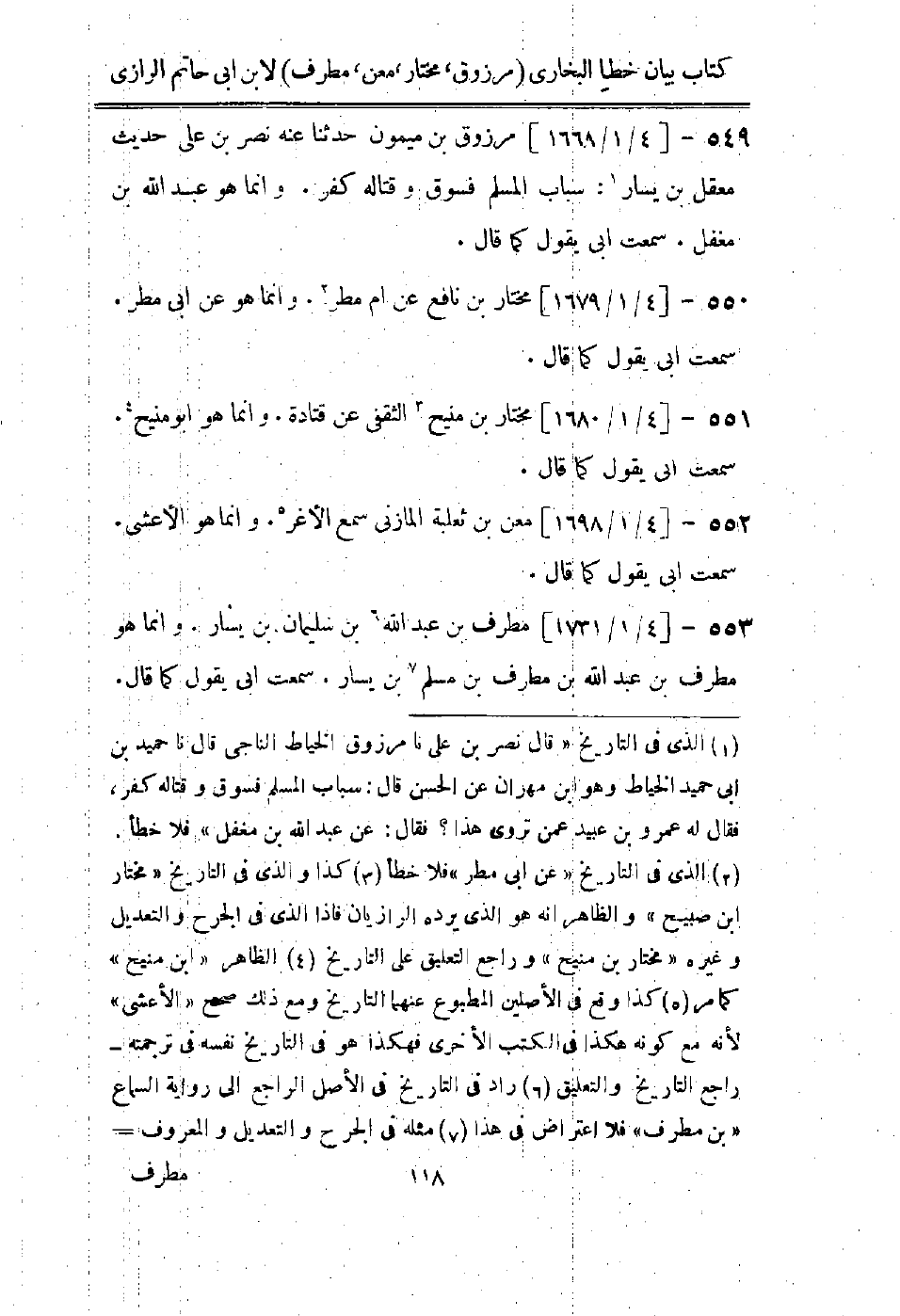 (2) الذى في التاريخ " عن ابى مطر " فلا خطأ (3) كذا والذى في التاريخ " مختار ابن صبيح " والظاهر انه هو الذى يرده الرازيان فإذا الذى في الجرح والتعديل وغيره " مختار بن منيح " وراجع التعليق على التاريخ (4) الظاهر " ابن منيح " كما مر (5) كذا وقع في الاصلين المطبوع عنهما التاريخ ومع ذلك صحح " الاعشى " لانه مع كونه هكذا في الكتب الاخرى فهكذا هو في التاريخ نفسه في ترجمته - راجع التاريخ والتعليق (6) زاد في التاريخ في الاصل الراجع إلى رواية السماع " بن مطرف " فلا اعتراض في هذا (7) مثله في الجرح والتعديل والمعروف = (*)