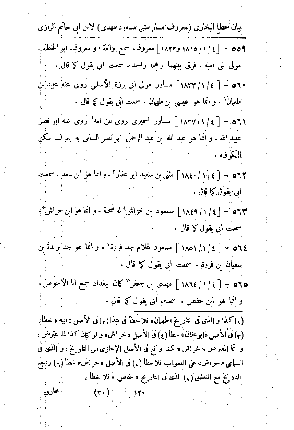 وانما المعترض " خراش " كذا وقع في الاصل الاجازى من التاريخ، والذى في السماعي " حراش " على الصواب فلا خطأ (5) في الاصل " حراس " خطأ (6) راجع التاريخ مع التعليق (7) الذى في التاريخ " حفص " فلا خطأ.