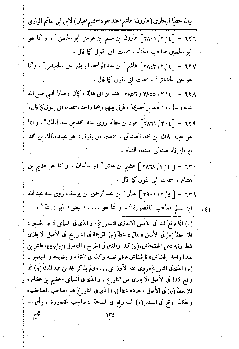 (1) انما وقع كذا في الاصل الاجازى للتاريخ، والذى في السماعي " أبو الحسين " فلا خطأ (2) في الاصل " هلتم " خطأ (3) الترجمة في التاريخ في الاصل الاجازى فقط وفيه " عن الخشخاش " (4) كذا والذى في الجرح والتعديل 4 / 2 / 447 " هاشم بن عبد الواحد الجشاش " فالجشاش هاشم نفسه وكذا في المشتبه وتوضيحه والتبصير.