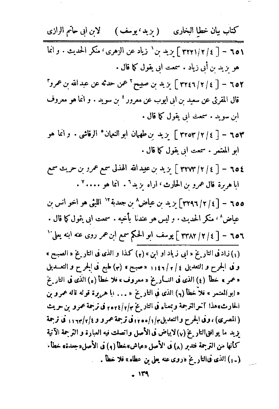 (1) زاد في التاريخ " ابى زياد أو ابن " (2) كذا والذى في التاريخ " الصبح " وفى الجرح والتعديل 4 / 2 / 1146 " صبح " (3) طبع في الجرح والتعديل " عمر " خطأ (4) الذى في التاريخ " معروف " فلا خطا (5) الذى في التاريخ " أبو المعتمر فلا خطا (6) الذى في التاريخ "..ابا هريرة قوله قاله عمرو بن الحارث " هذا آخر الترجمة وبمعناه في التاريخ 3 / 2 / 2524 في ترجمة عمرو بن حريث (المصرى) ، وفى الجرح والتعديل 3 / 1 / 1255 في ترجمة عمرو و 4 / 2 / 1163 في ترجمة يزيد ما يوافق التاريخ (7) لا بياض في الاصل واتصلت فيه العبارة والترجمة الآتية كأنها من الترجمة فتدبر (8) في الاصل " عياش " خطأ (9) في الاصل " جعدة " خطأ.
